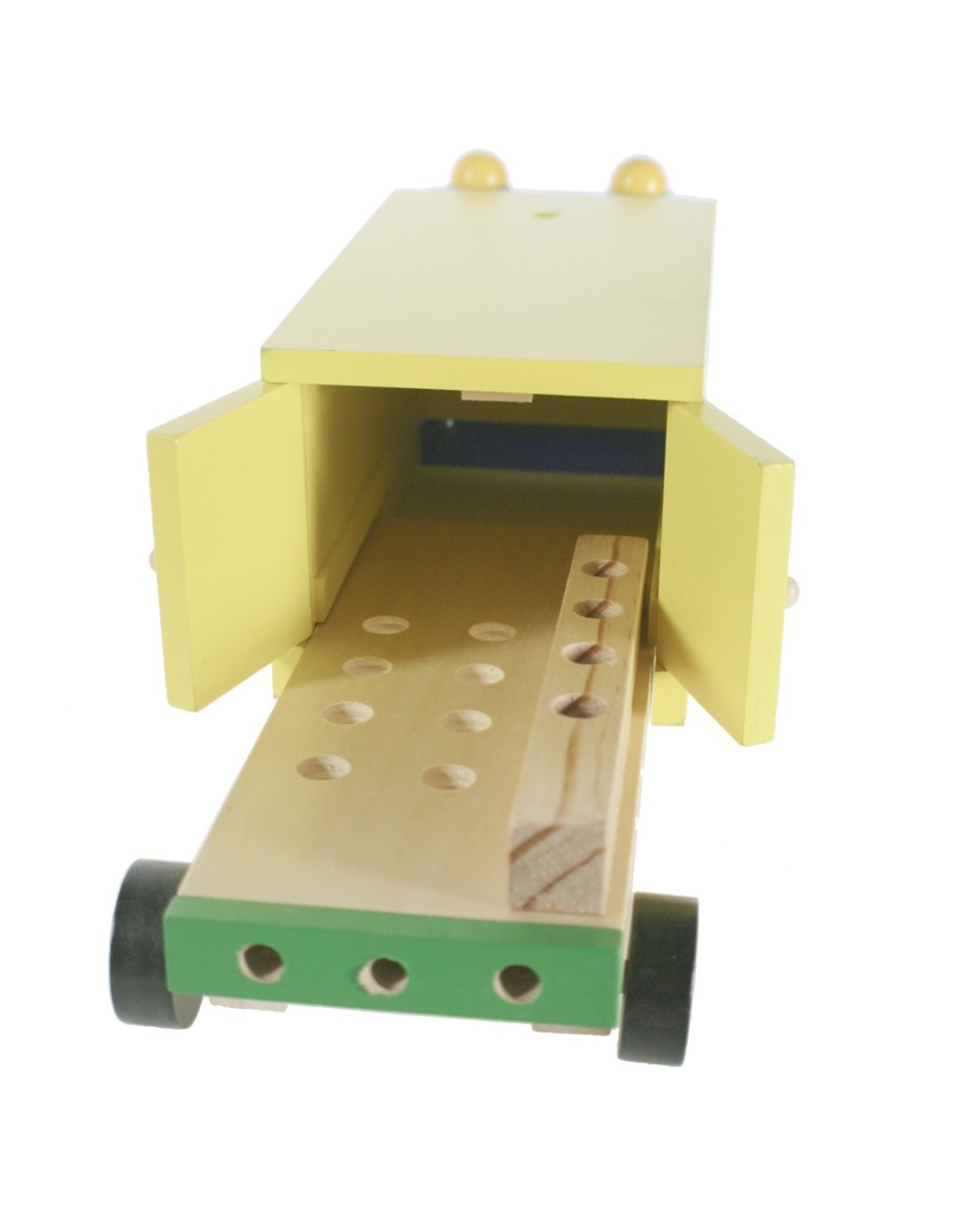 La superfície de càrrega del camió s'estén fins a gairebé 15 cm i es transforma en un banc de treball interactiu. Inclou perforacions on els nens poden col·locar cargols, claus, un martell, una clau de femelles i diverses femelles. Aquesta funció permet als petits exercitar les seves habilitats motores mentre juguen.