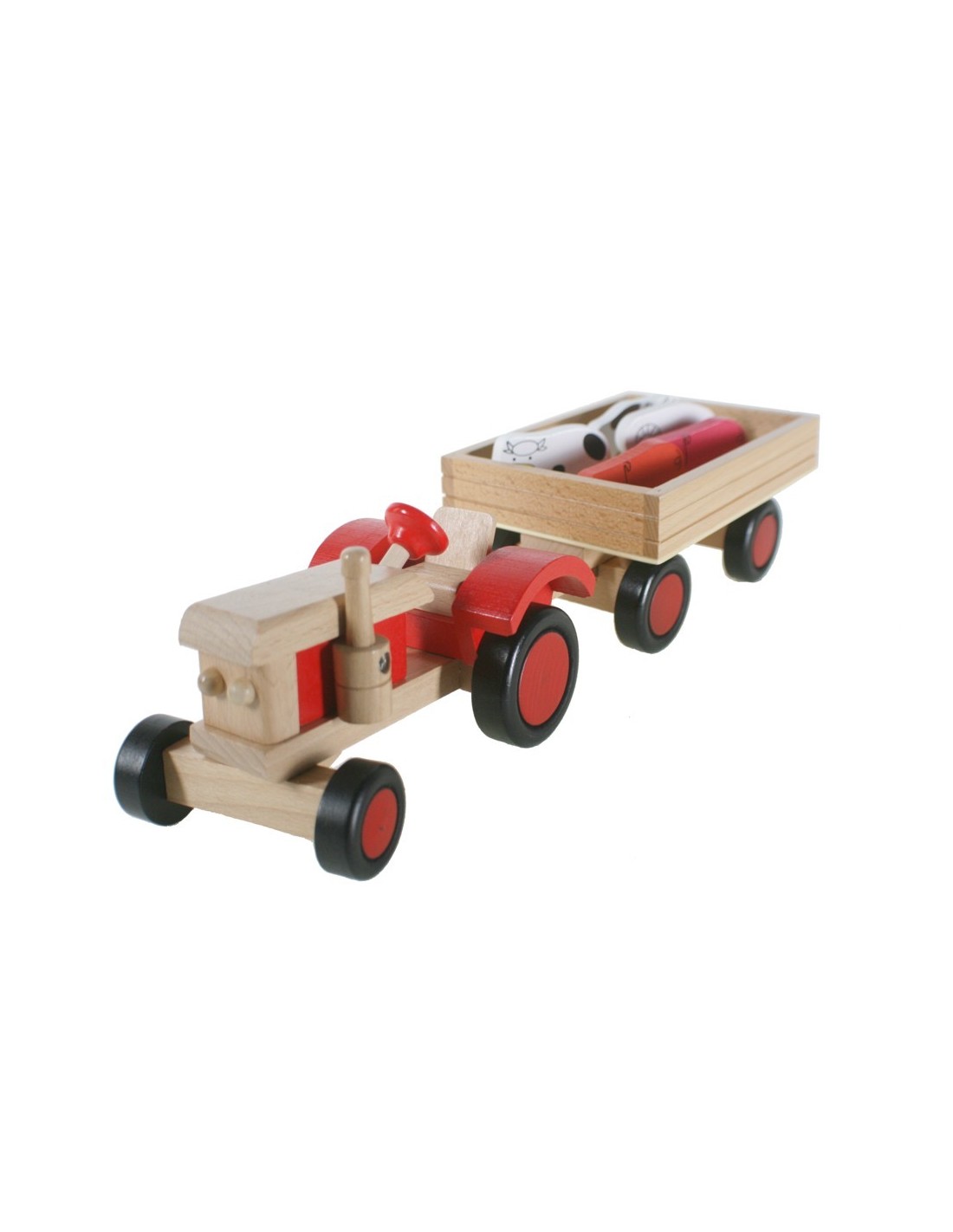 Imagina't un dia a la granja: el tractor està llest, el remolc està carregat d'animalets, i els camps esperen. Aquest extraordinari tractor de fusta de faig porta els nens a una aventura al camp, cultivant la seva imaginació i habilitats motores.