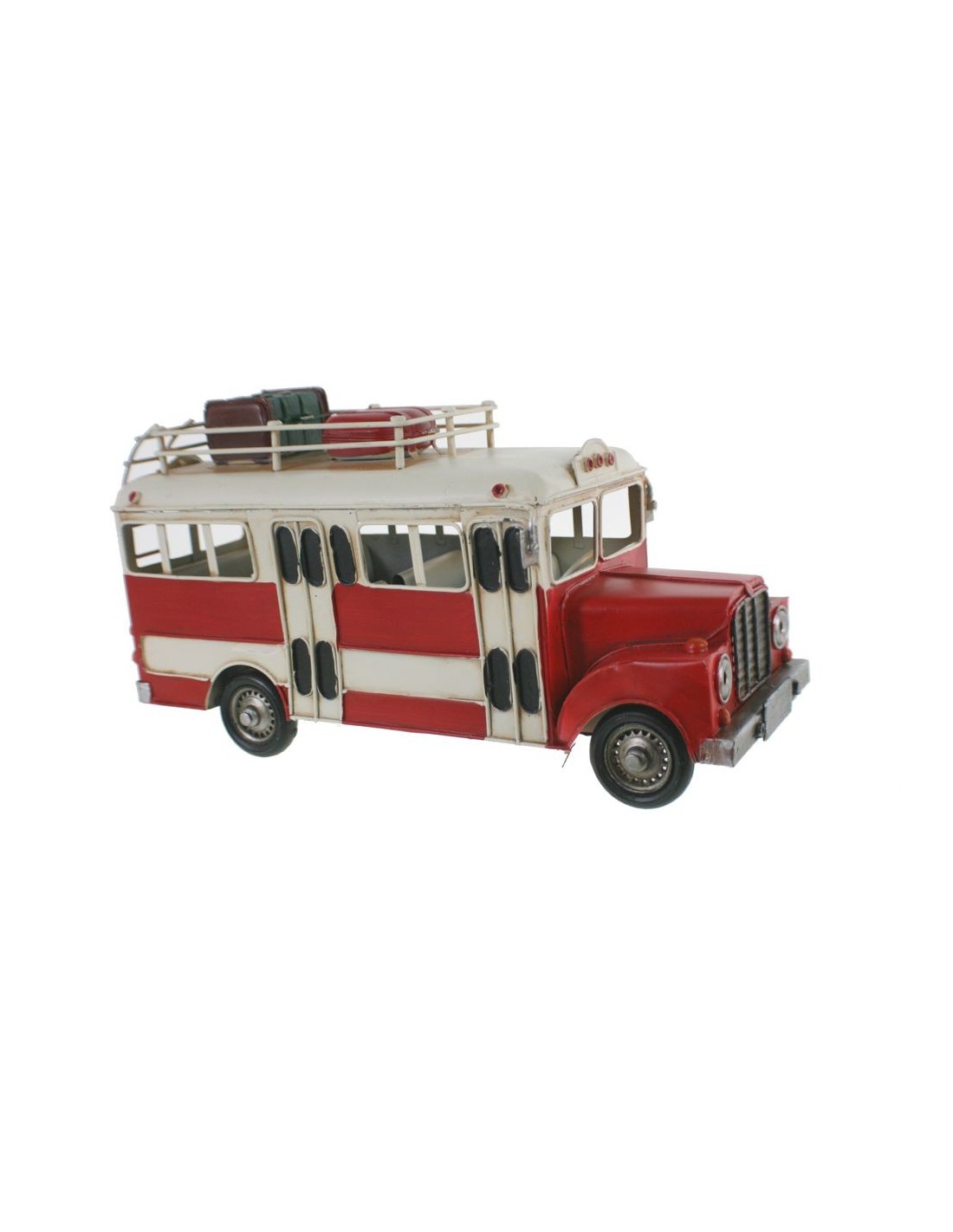 Autobús de metall de color blanc i vermell rèplica estil retro per a col · leccionistes i decoració llar. Mides: 16x36x12 cm.