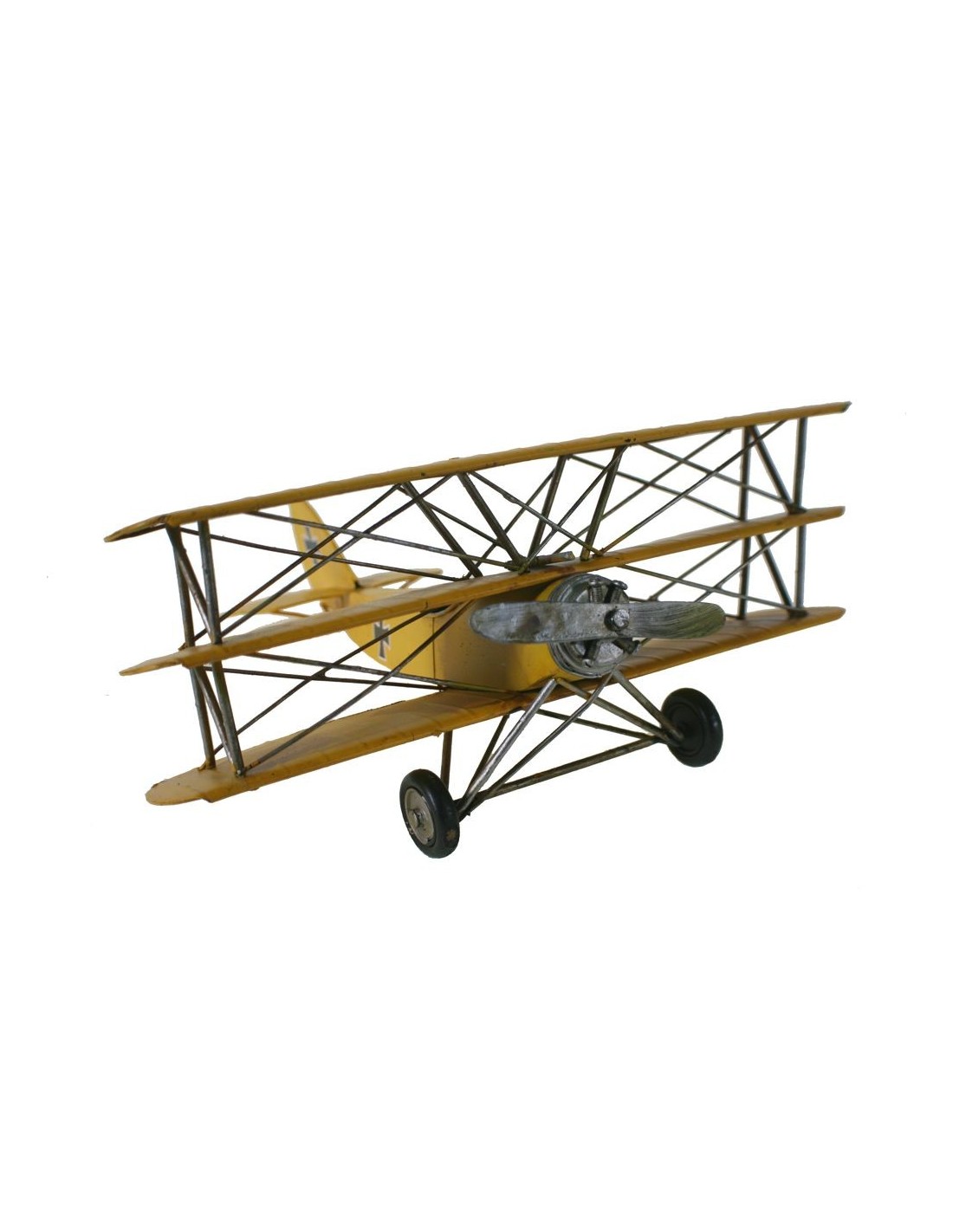 Rèplica Avió Triplano de Metall Estil Retro de Color Groc per a Decoració, Llar i Col·leccionisme. Mides 16x33x33 cm.