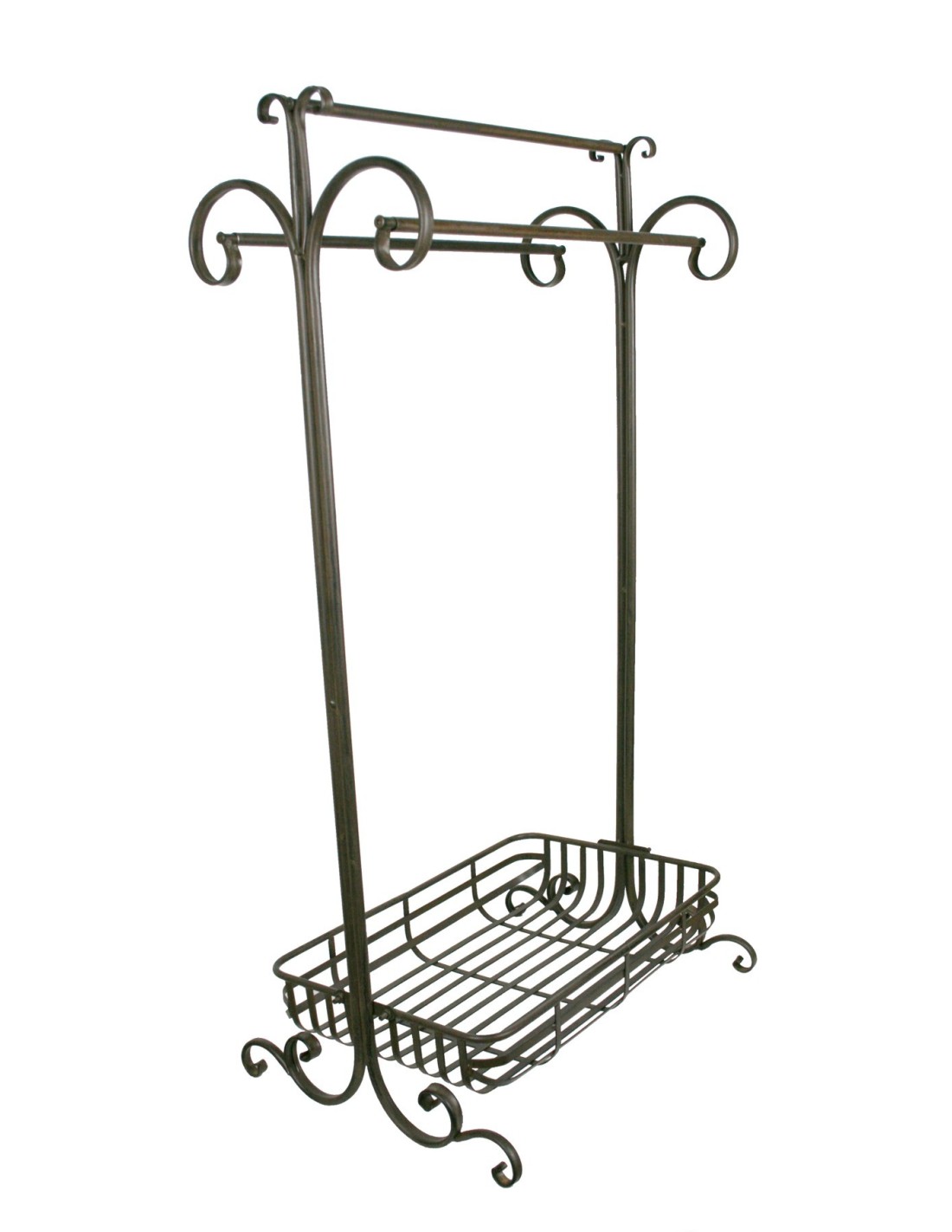 Su estructura metálica y su acabado óxido lo convierten en un complemento ideal para ambientes rústicos o industriales. Incluye tres barras superiores para colgar toallas y una cesta inferior de gran capacidad, perfecta para guardar toallas pequeñas, productos de higiene o artículos decorativos.