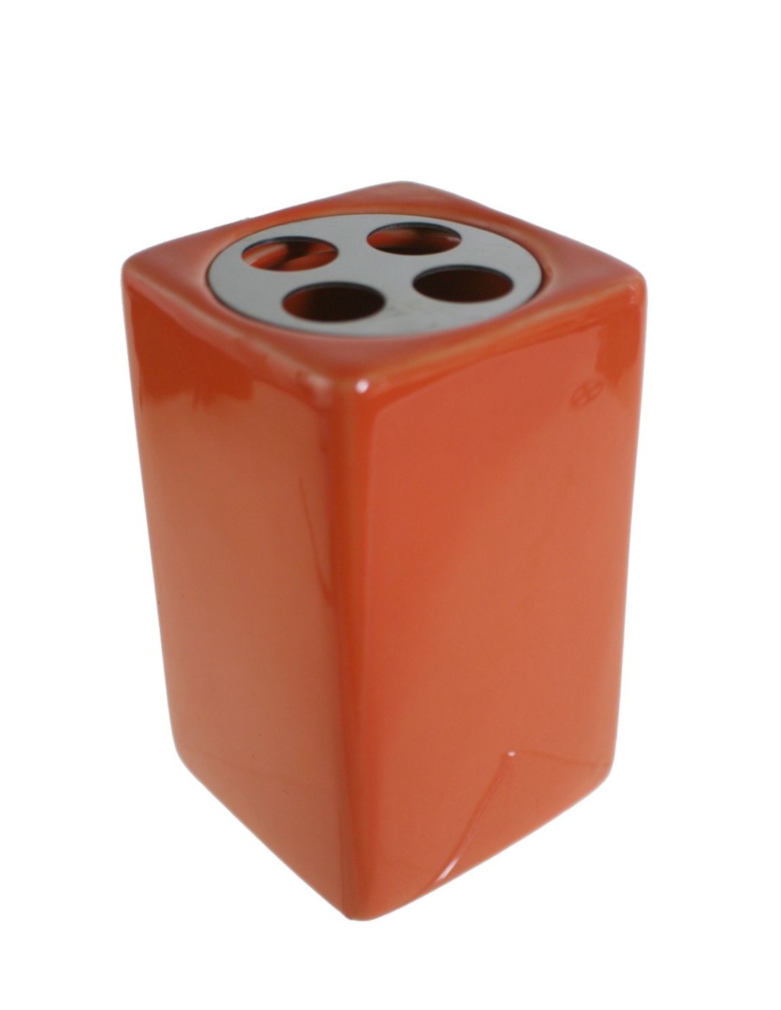 Organizador Porta Cepillos de Dientes de Cerámica Color Naranja y Acero Inoxidable. Medidas: 11x7x7 cm.
