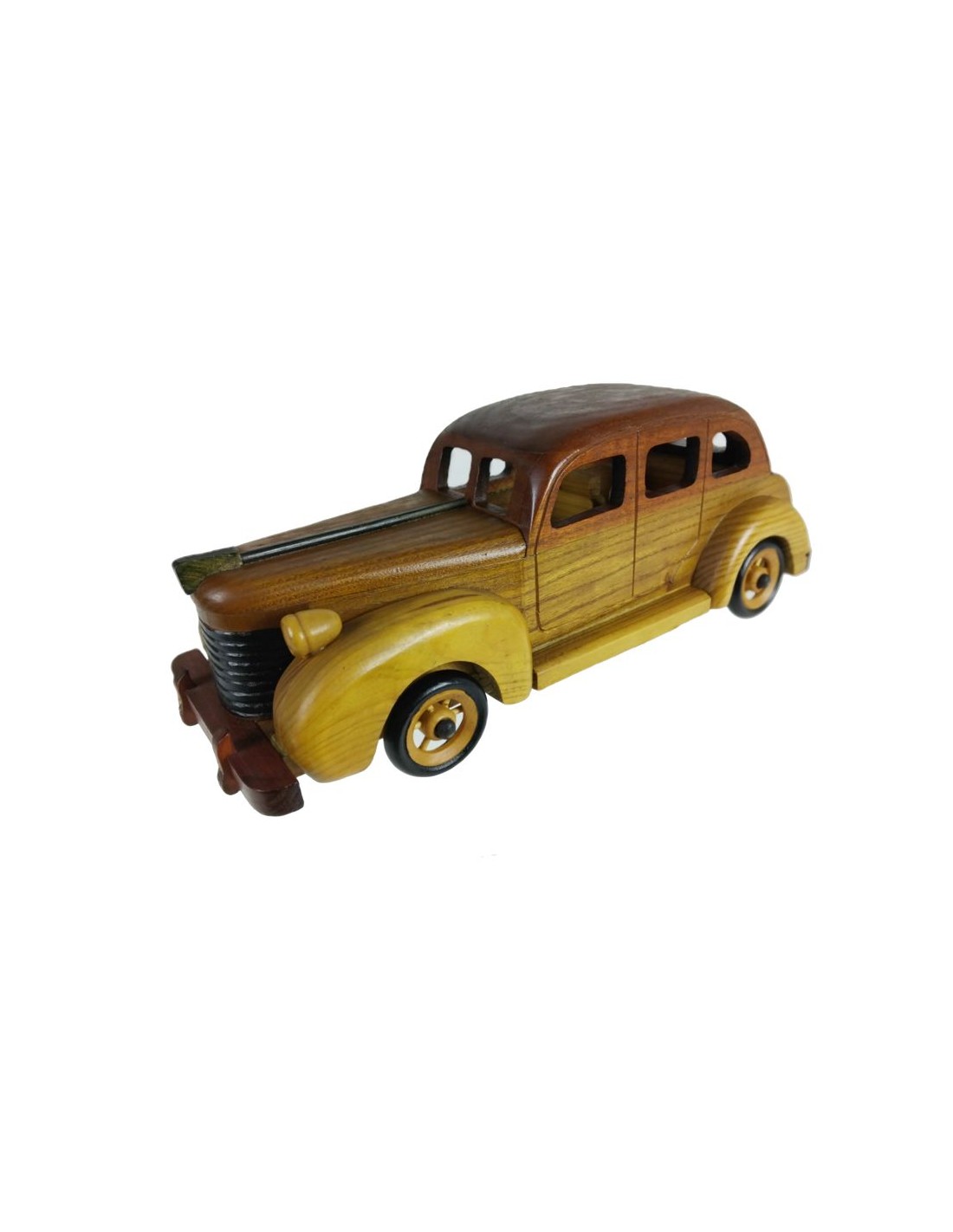 Este coche clásico de madera, elaborado de forma artesanal, captura la esencia de la elegancia de antaño. Su acabado pulido y el contraste natural de tonos en la madera destacan el trabajo minucioso del artesano. Ideal para coleccionistas, amantes de lo retro o como pieza decorativa en cualquier estancia.