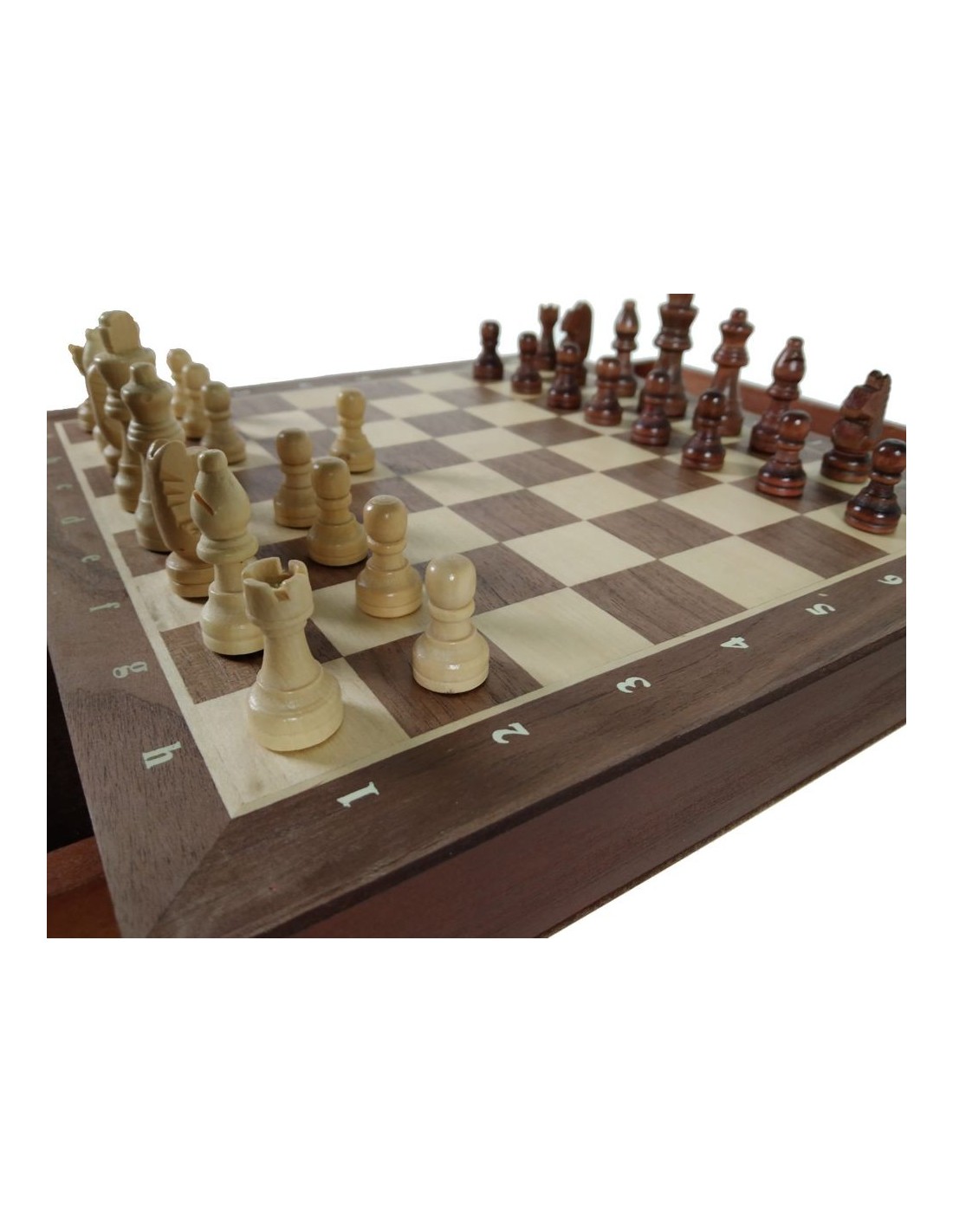 Ajedrez de madera con base magnética y cajones laterales, donde estrategia, concentración y diversión se unen en cada partida.