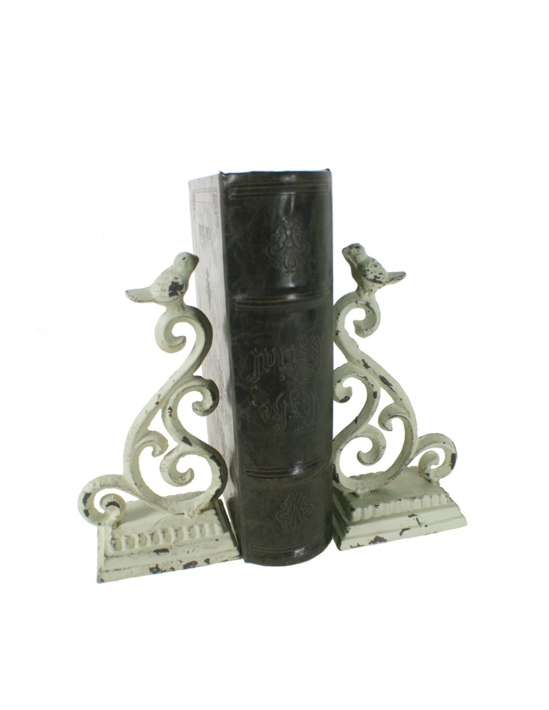 Juego de dos apoya libros hechos de hierro fundido acabado envejecido color crema y construcción muy reforzada para decorar tu estantería.