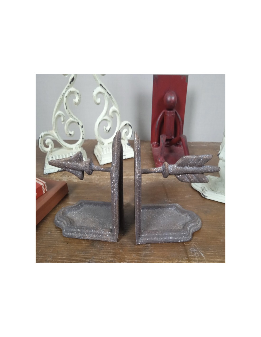 Juego dos apoya libros de hierro fundido con flecha color óxido. Medidas: 12x12x8 cm.