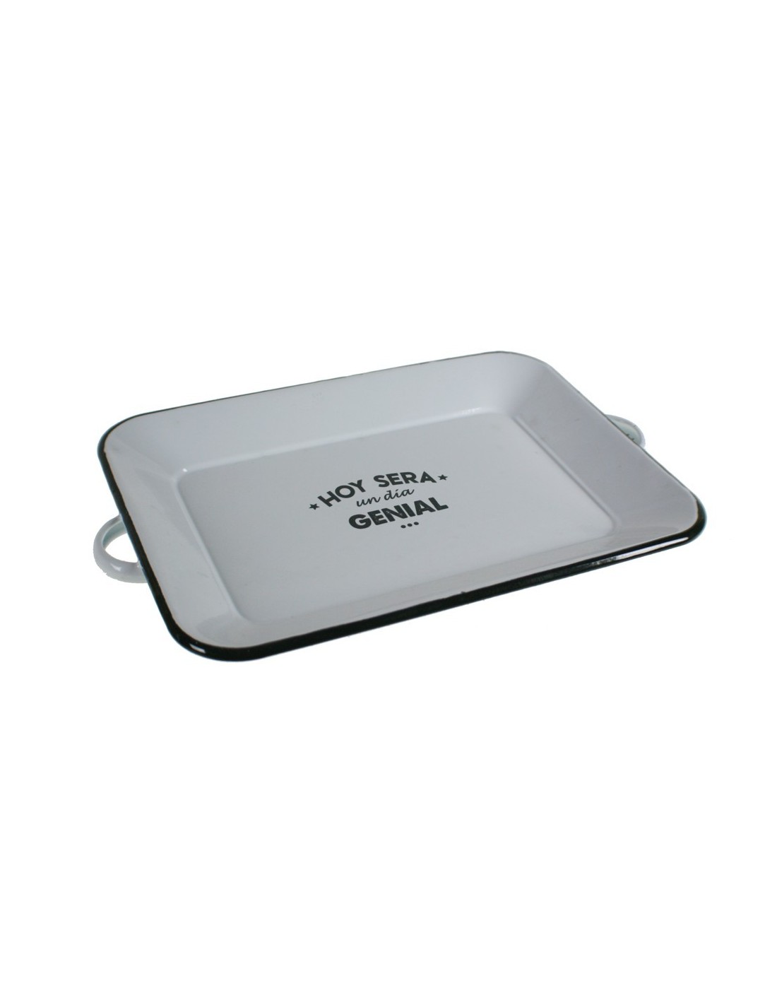 Bandeja Esmaltada Blanca con Frase 'Hoy será un día Genial': Elegancia y Resistencia para tu Cocina.