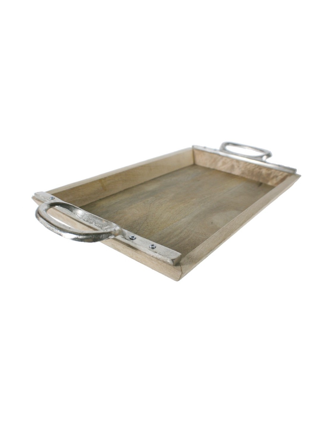 Bandeja de madera totalmente maciza natural con asa de metal en bordes. Construcción rústica de estilo vintage, muy reforzada para un ambiente hogareño.