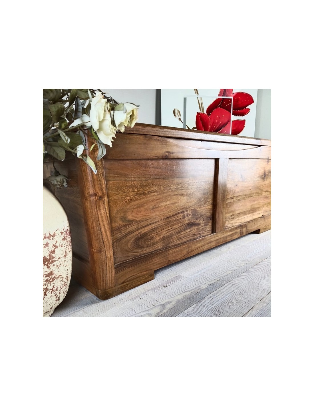 Este arcón está realizado en madera maciza de acacia, lo que resalta su veta natural y calidez. Su diseño simple y elegante lo convierte en un elemento decorativo por sí mismo, ideal para cualquier rincón del hogar.