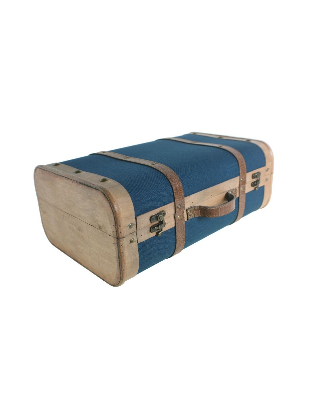 Maleta realizada en madera de álamo y forrada con tejido de lienzo en color azul. Los cierres, asa y correas en símil de piel aportan un hermoso contraste que combina materiales y texturas con mucho gusto. Ideal para ambientes nórdicos, vintage o eclécticos.