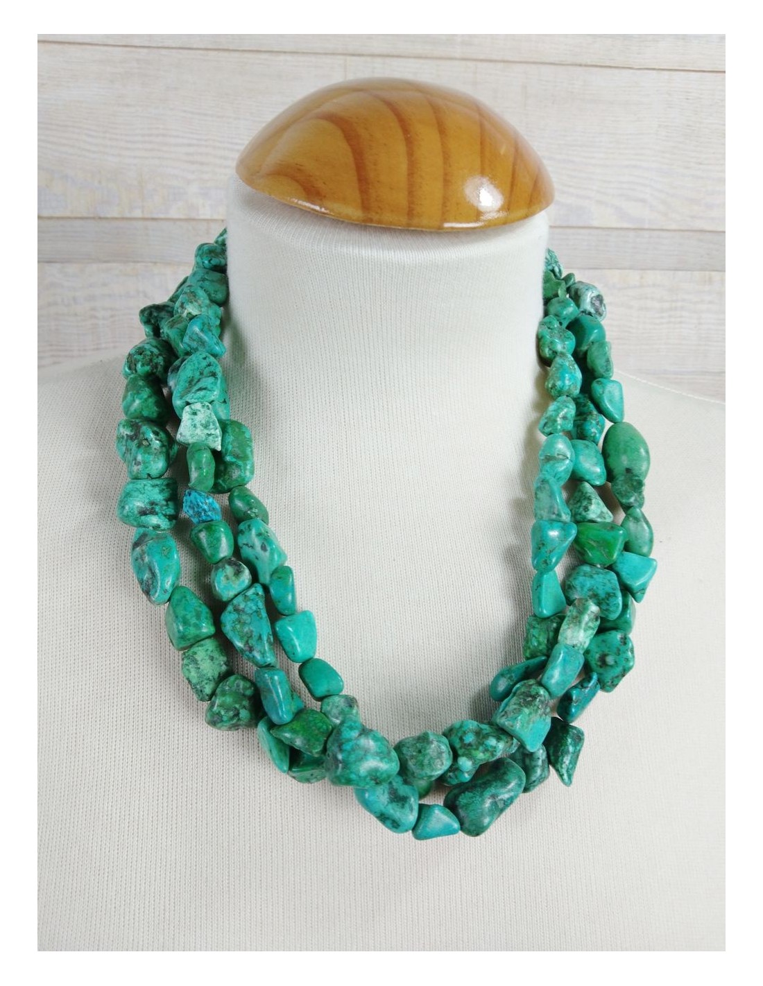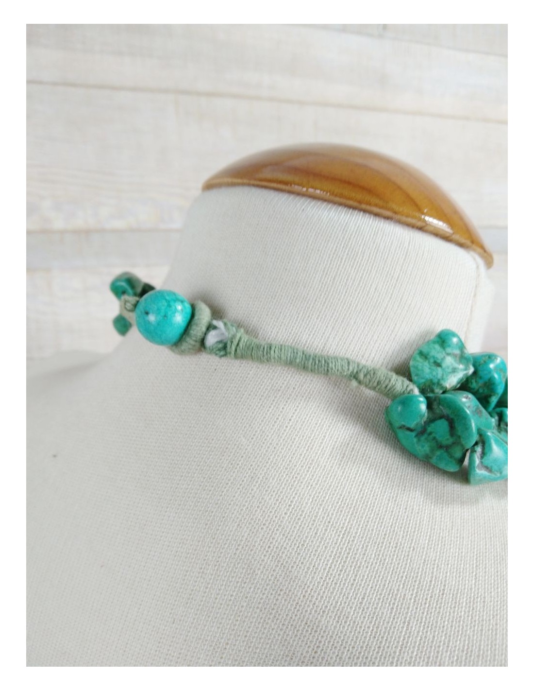 Cada collar es único, ya que las piedras tienen diferente tamaño, vetas y tonalidad. La turquesa se considera una piedra curativa y protectora. Desde la antigüedad se ha utilizado para fabricar amuletos.