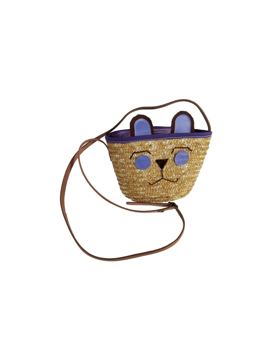 Bolso bandolera infantil de fibras naturales con dibujo de color lila y cierre de cremallera. Medidas: 16x23 cm.