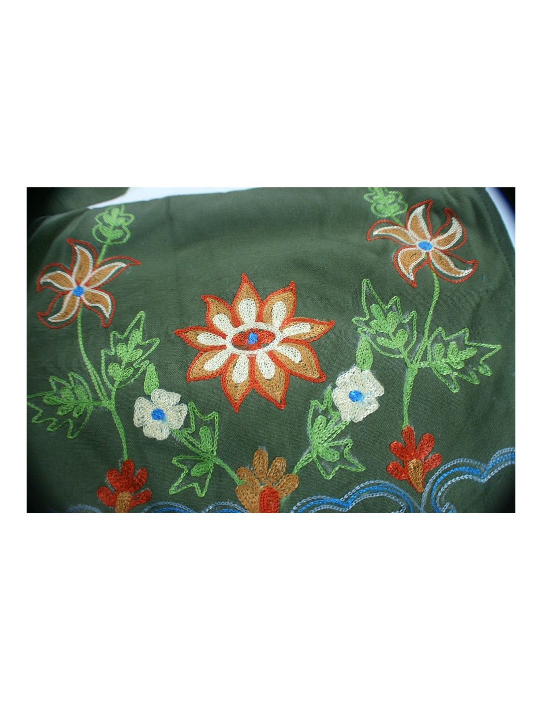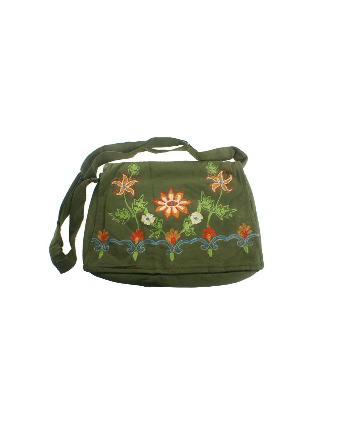 Bolso multiuso étnico bordado hippie con solapa y asas de tejido algodón color verde. Medidas: 29x35 cm. Aprox.