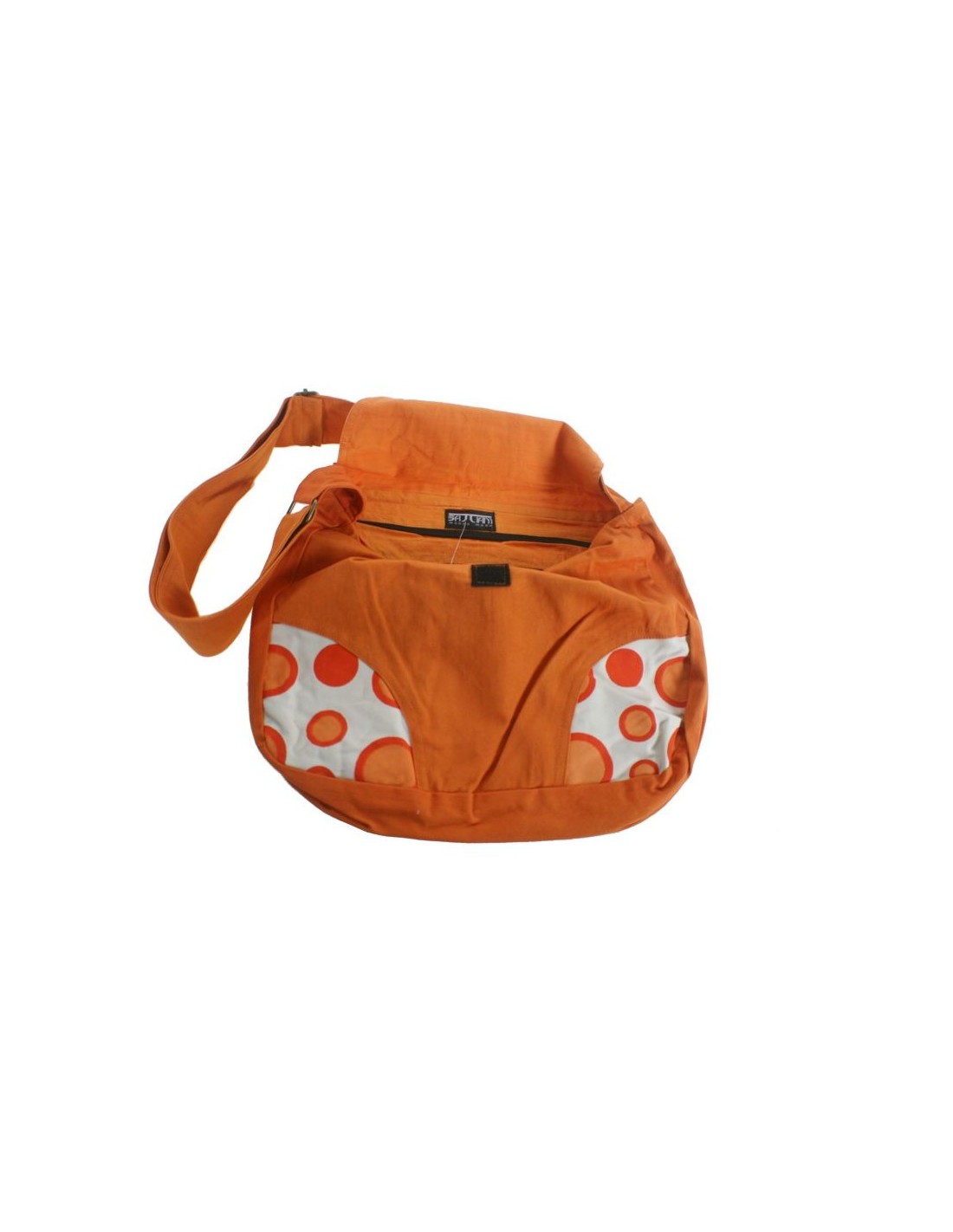 Bolso bandolera multiuso de color naranja interior con bolsillo y cierre en cremallera, diseño exclusivo étnico y parche hippie. Esta prenda ha sido elaborada artesanalmente en el Nepal. Este bolso puede convertirse en un básico para diario en el que podrás llevar tus objetos.