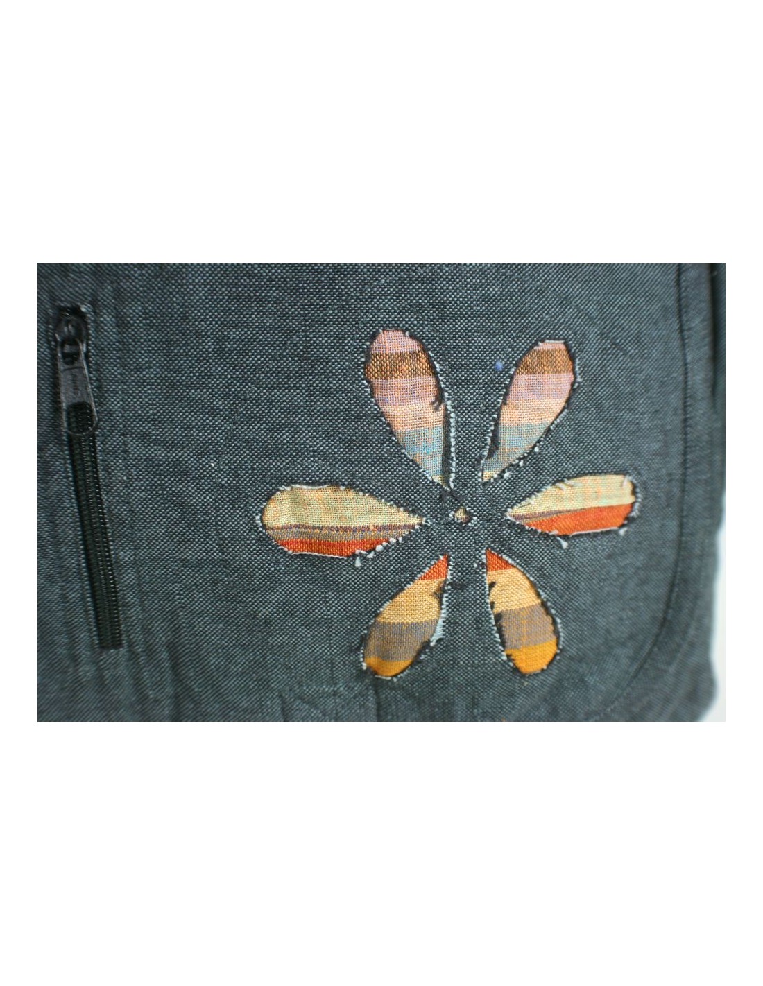 Bolso bandolera multiuso de color gris oscuro y solapa en interior con dos compartimientos con cierre en cremallera i bolsillo interior, y compartimiento en solapa y en lateral diseño exclusivo étnico hippie. Esta prenda ha sido elaborada artesanalmente en el Nepal. Este bolso puede convertirse en un básico para diario en el que podrás llevar tus objetos.