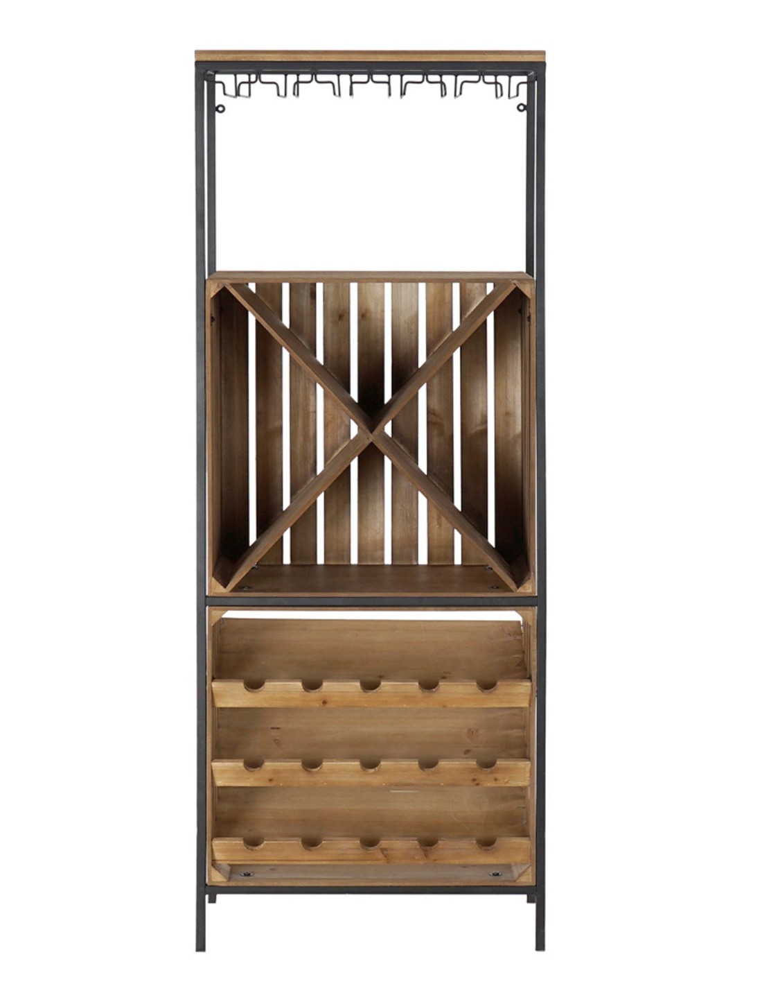 Este botellero vertical combina madera y metal en un diseño rústico y elegante. Perfecto para almacenar vino, cava o licores con estilo, incluye un soporte para copas y un diseño compacto que se adapta a cualquier espacio. Ideal para bodegas, salones y comedores