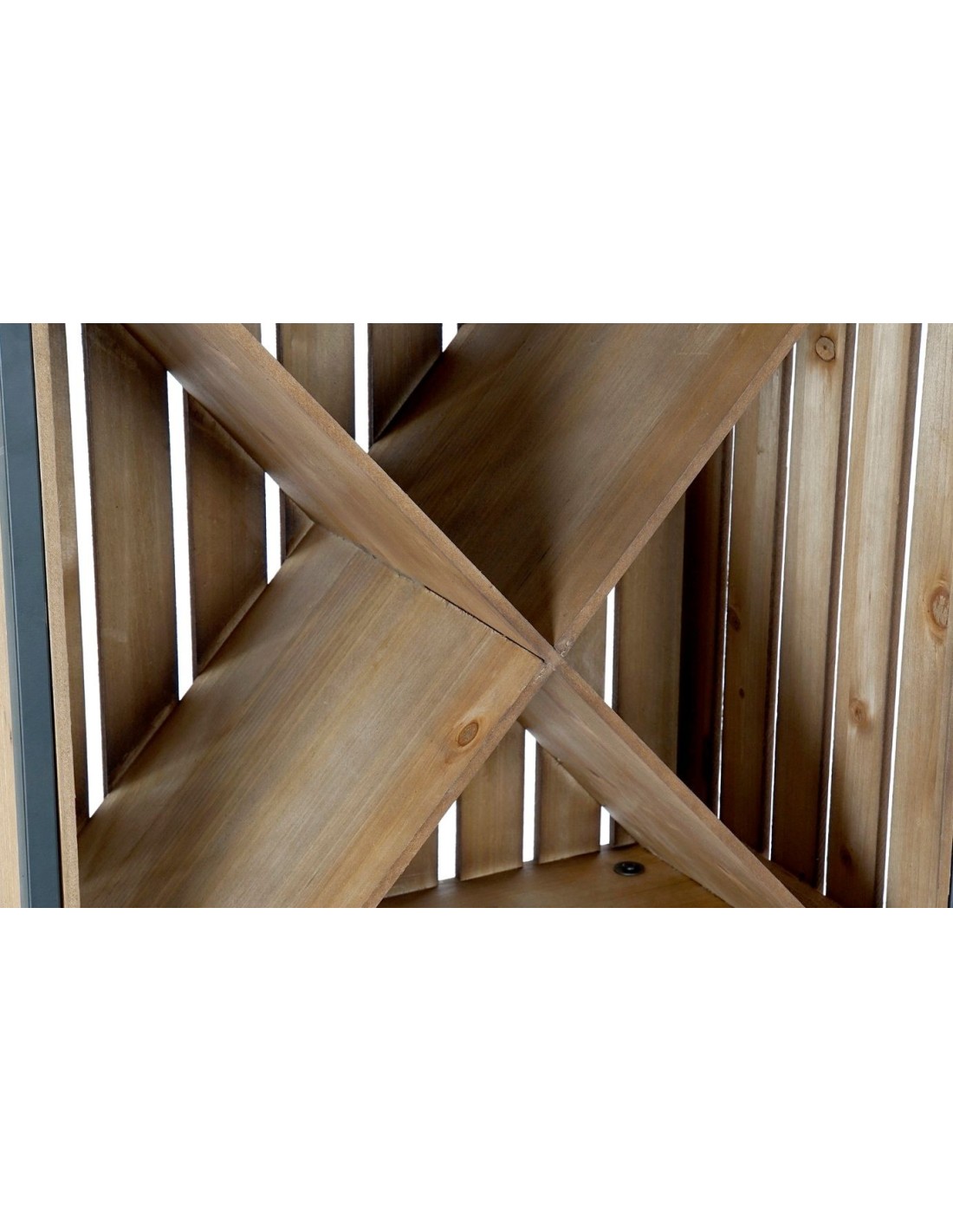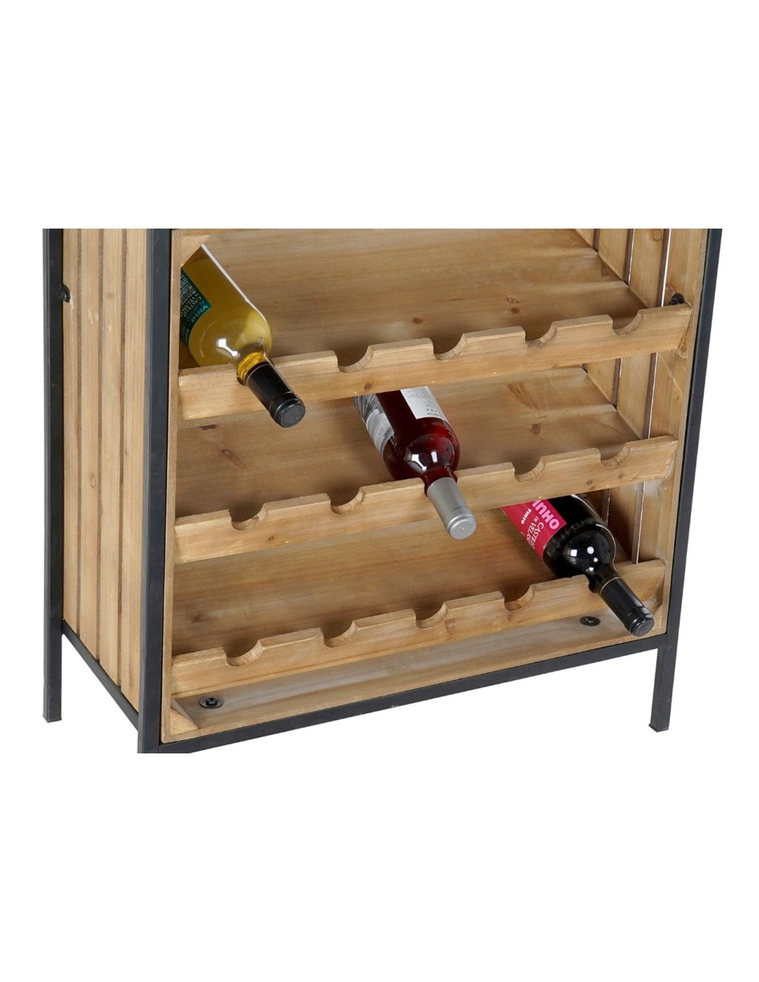 Fabricado con madera maciza y estructura de metal, este botellero destaca por su robustez y durabilidad. Su acabado en madera natural aporta calidez, mientras que el metal le da un toque industrial y sofisticado.