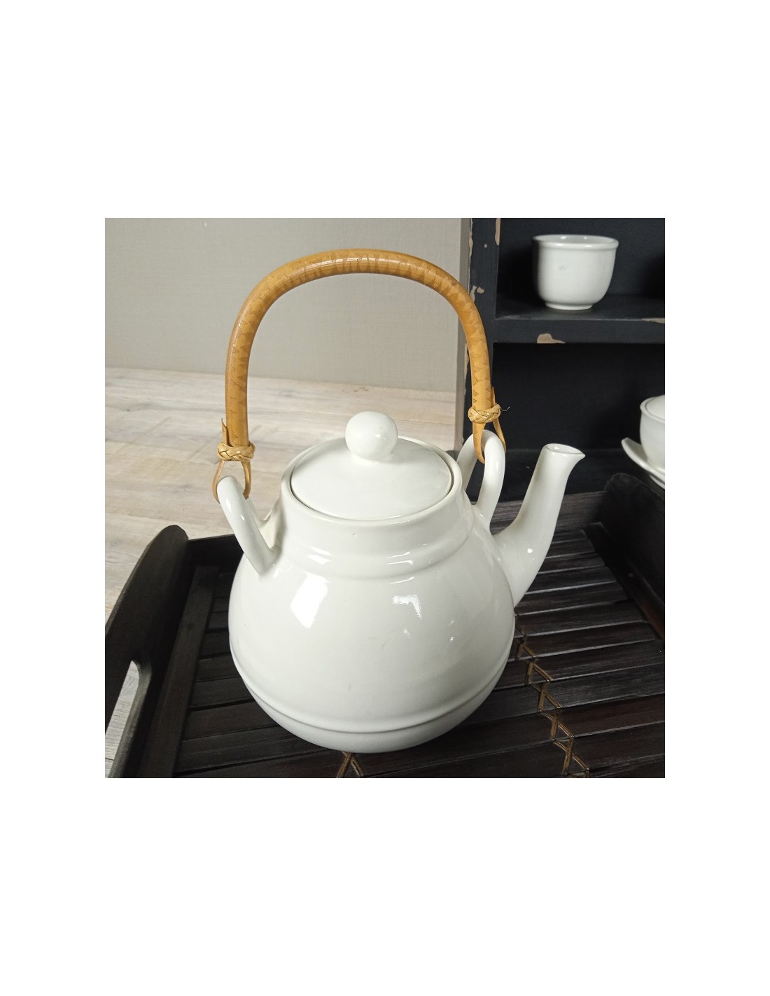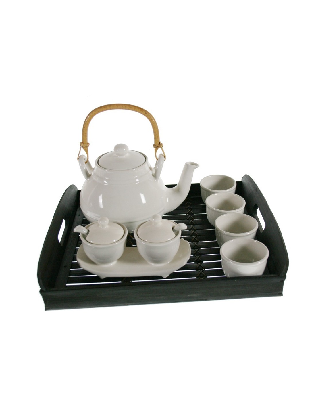 Conjunto Té Porcelana blanca con Bandeja de bambú 4 servicios estilo clásico servicio de mesa. Medidas: 7x34x29 cm.