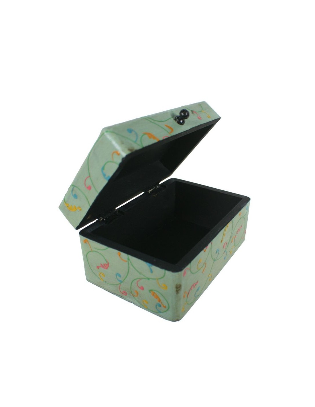 Caja de madera pintada tonos verdes y decoración con pintura repujada. Original de la India.