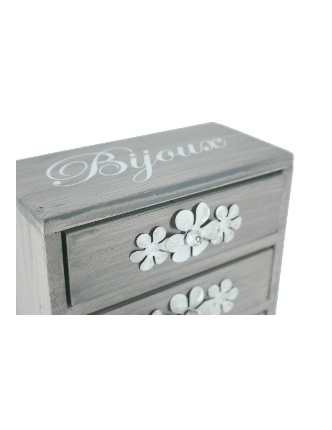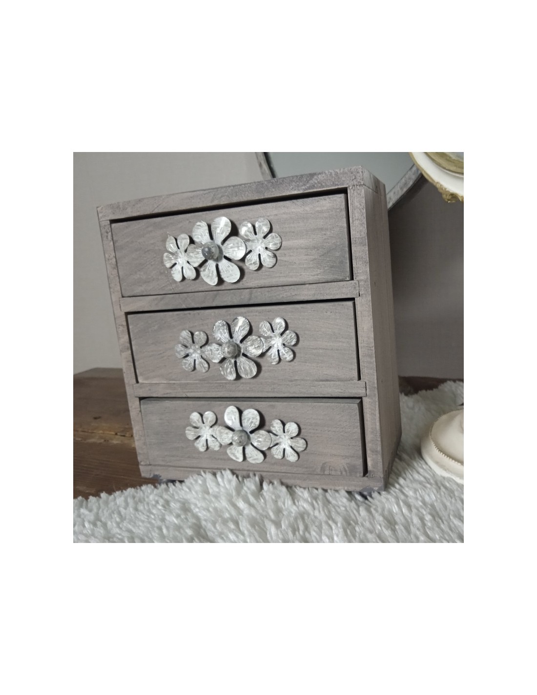 Bonita caja joyero en forma de mini cómoda con tres cajones de madera maciza con tiradores de metal tipo flores. Un lugar perfecto y decorativo para guardar pequeños recuerdos y un regalo ideal.