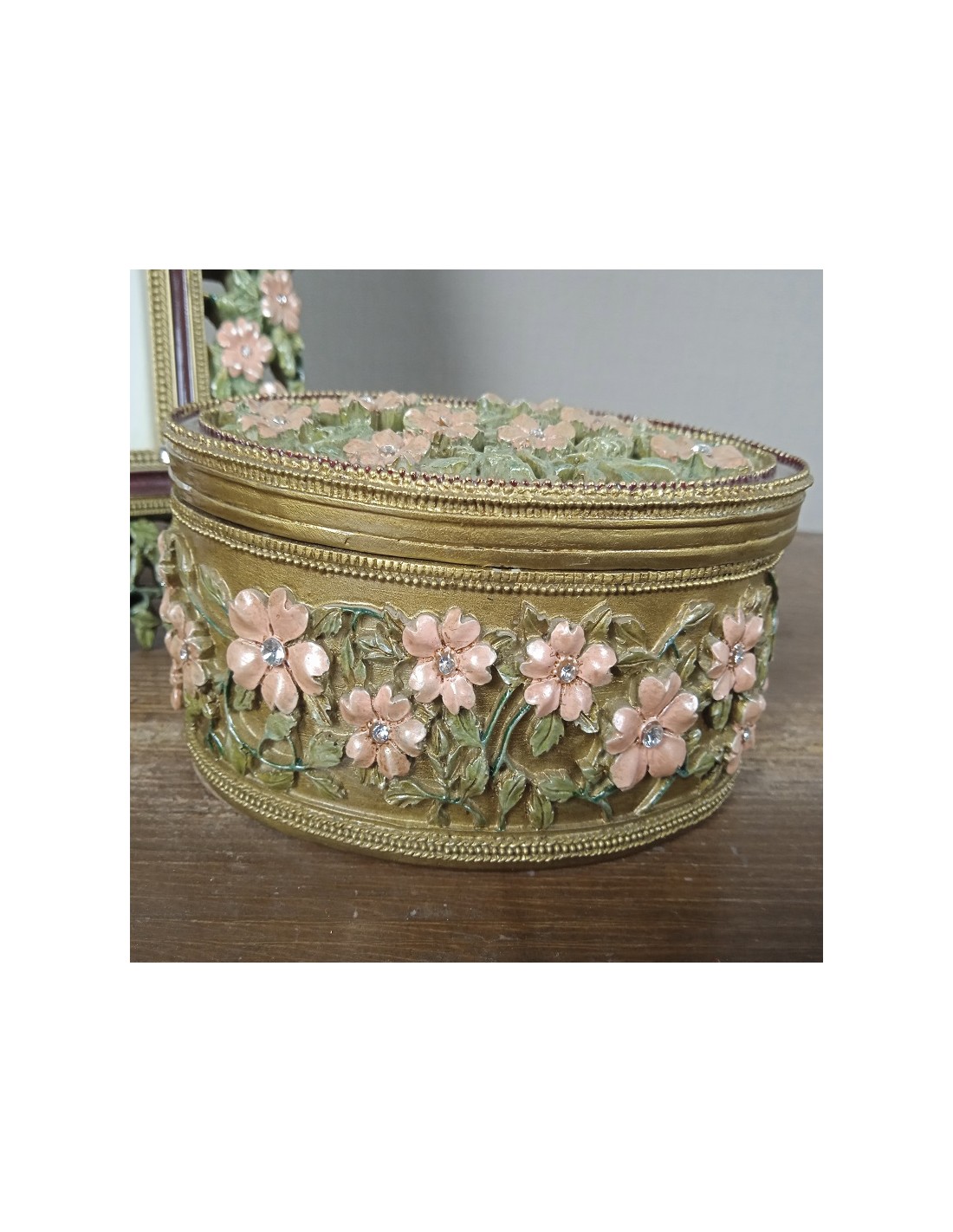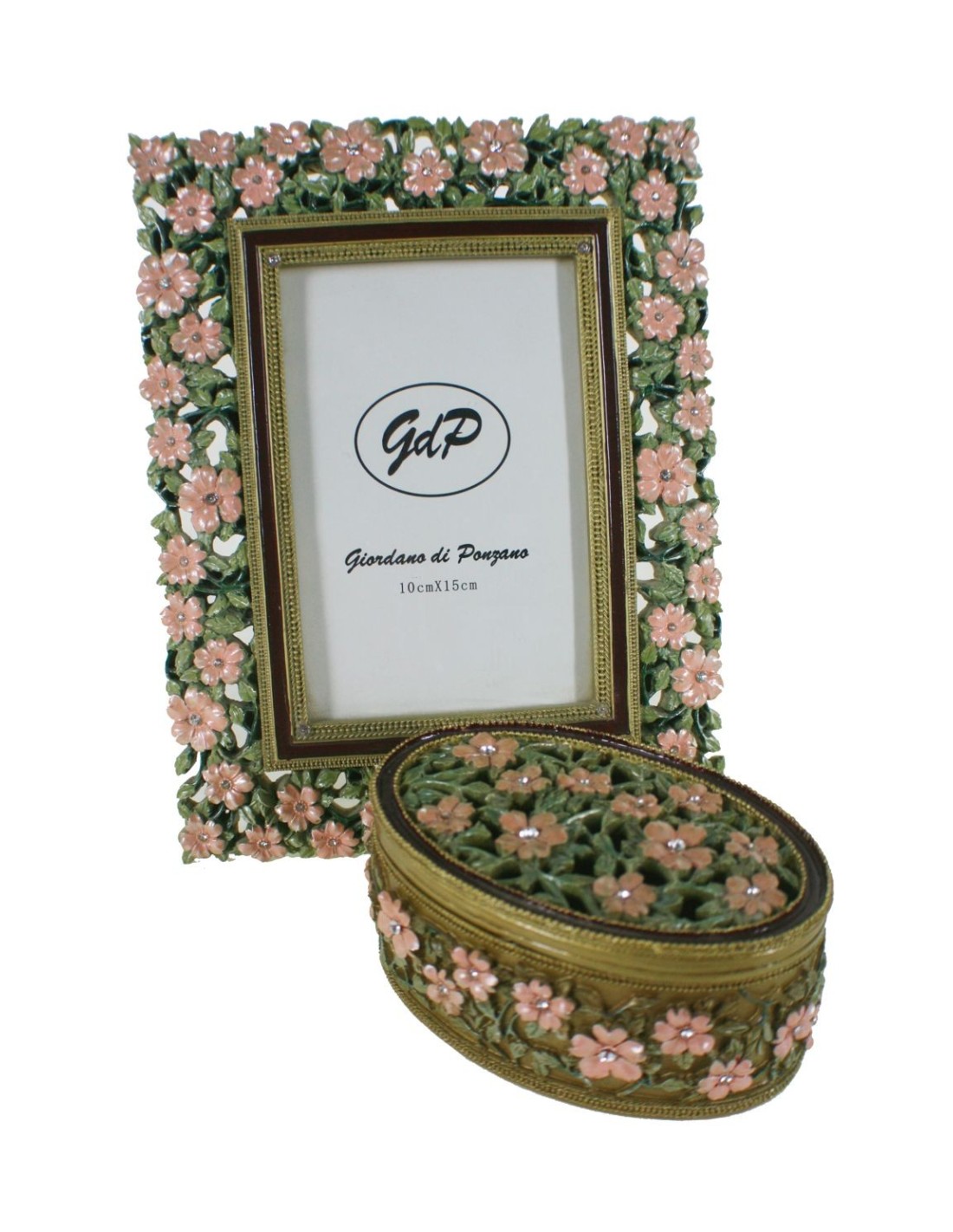 Marco Portafotos con Joyero, Decorado con Flores y con Pedrería en resina Color verde. Medidas: 23x18 cm.
