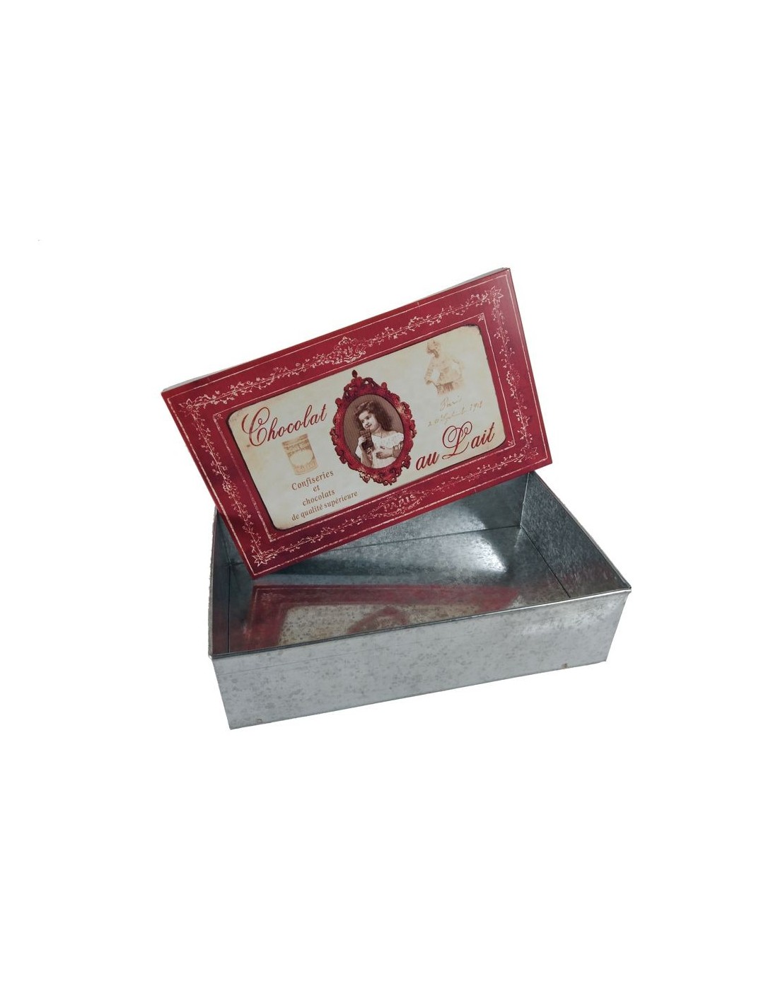 Esta es una caja de plancha de forma tradicional con tapa decorada de estilo vintage. En ella podrás guardar de forma ordenada el chocolate, dulces, caramelos,.... ¡Quizás se tendría que poner cerradura!
