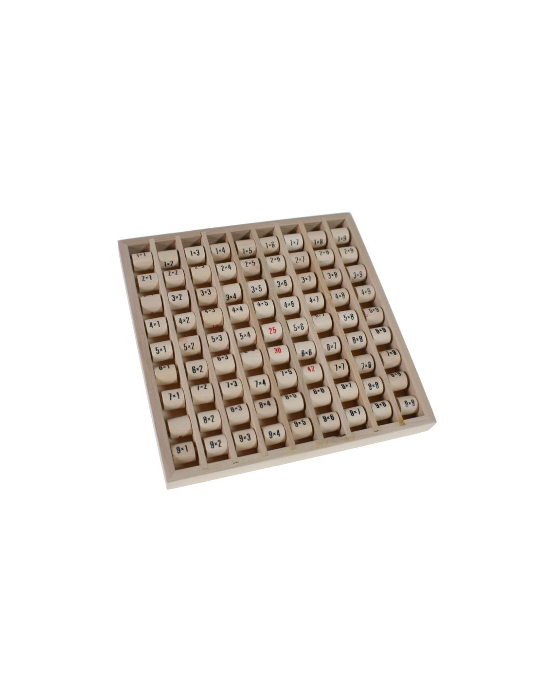 Esta tabla de multiplicar de madera con cilindros giratorios es una herramienta educativa ideal para que los niños practiquen las tablas del 1 al 9 de manera divertida. Al girar cada cilindro, se muestran las operaciones y sus resultados, convirtiendo el aprendizaje en un juego de descubrimiento.