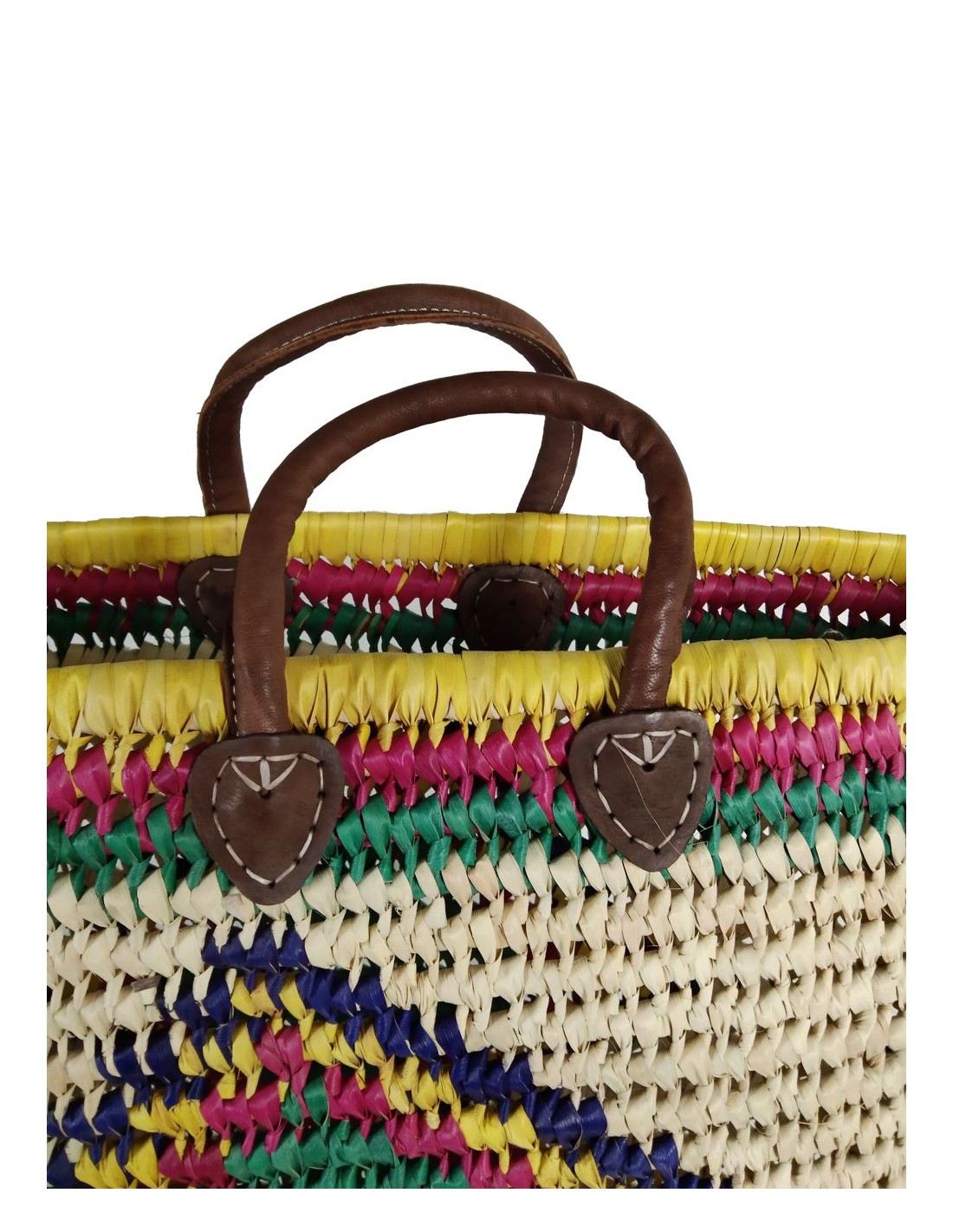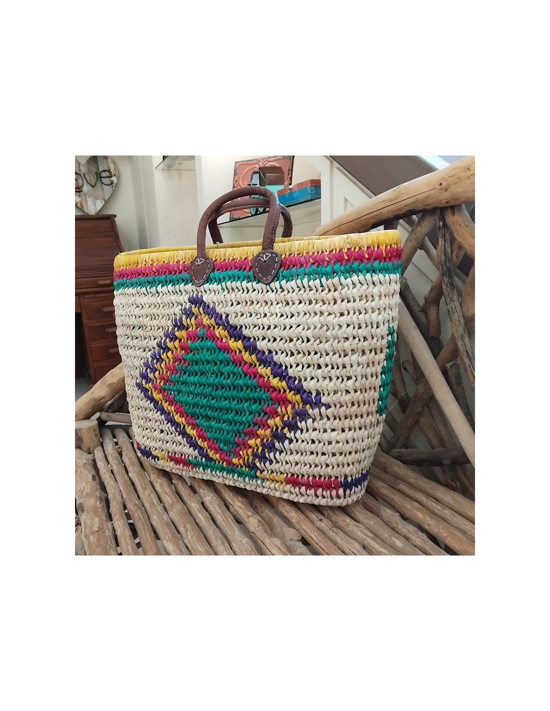 Cesta de palma natural tejida a mano, con asas de cuero y diseño colorido. Ideal para la compra, la playa o para regalar. Artesanía nacional con mucho estilo.