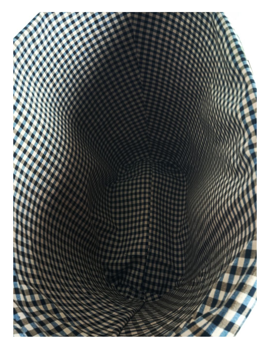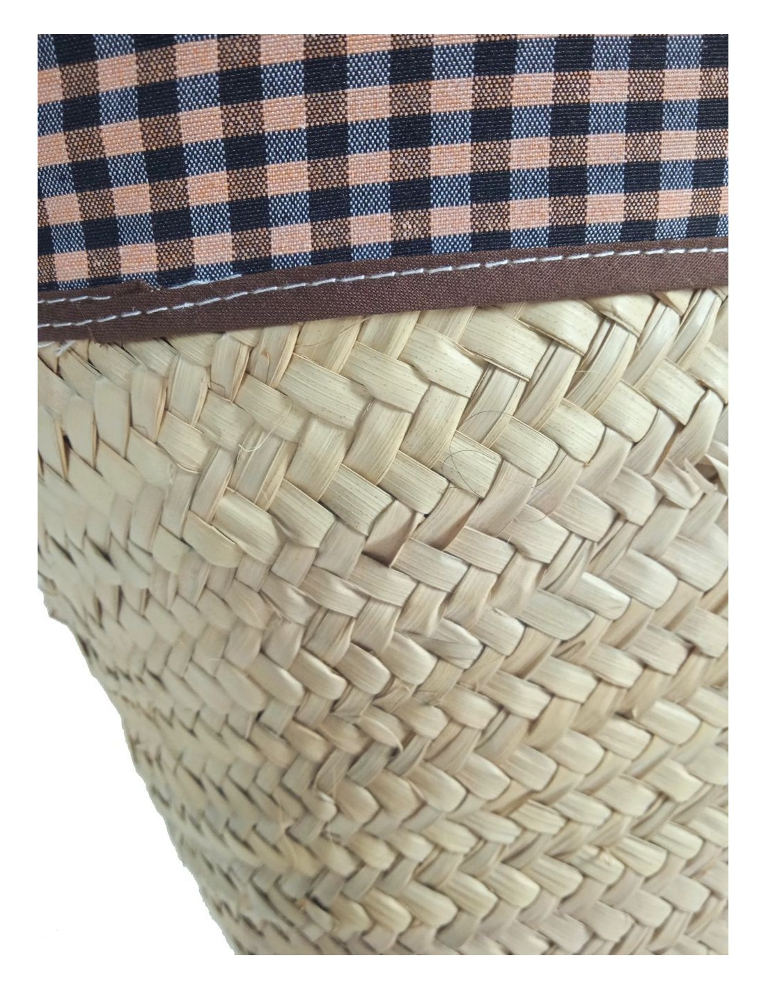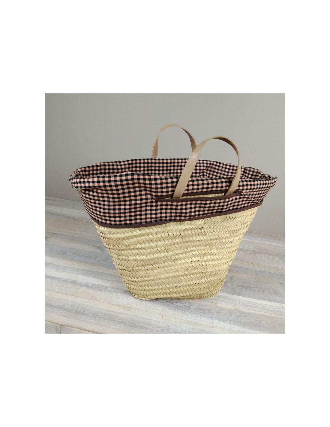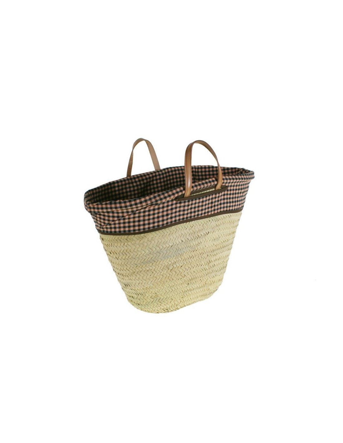 Cuenta con asas de cuero natural cosidas a mano y un forro interior de tela de fardo en color marrón, lo que aporta funcionalidad y un acabado cuidado. Su estructura ligera y su gran capacidad lo hacen cómodo y duradero.