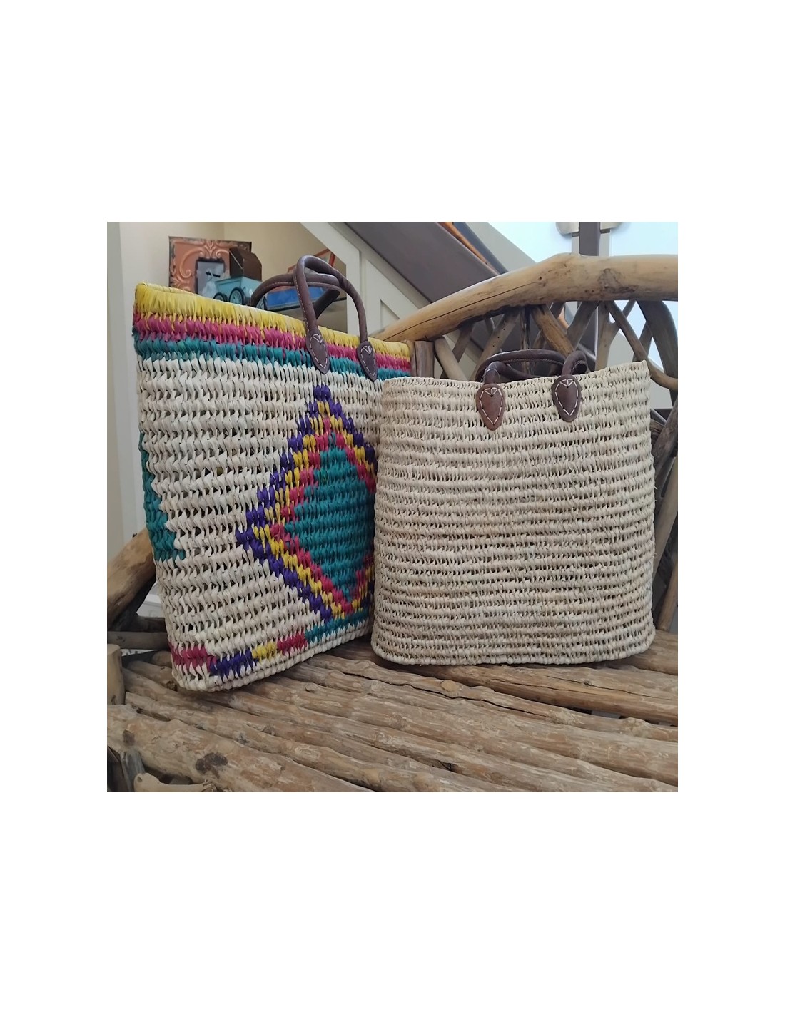 Una cesta grande, tejida a mano en palma natural, con asas de cuero. Ideal para la compra, la playa o como regalo funcional y con estilo.