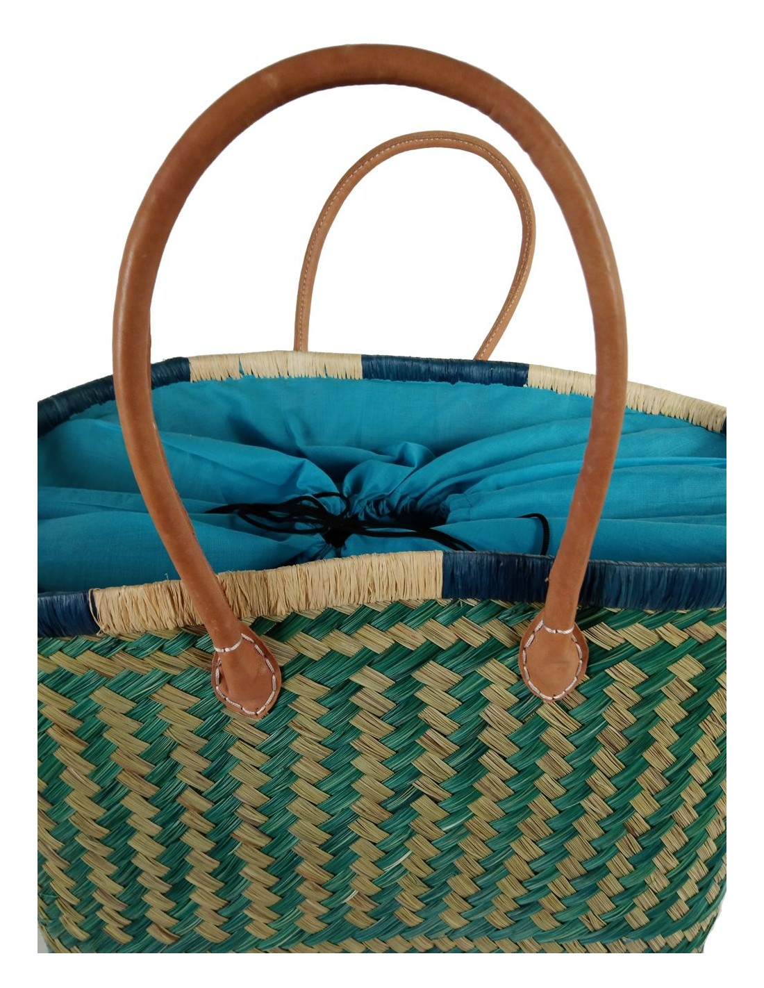 Capazo artesanal de rafia con forro azul y asas de cuero.
