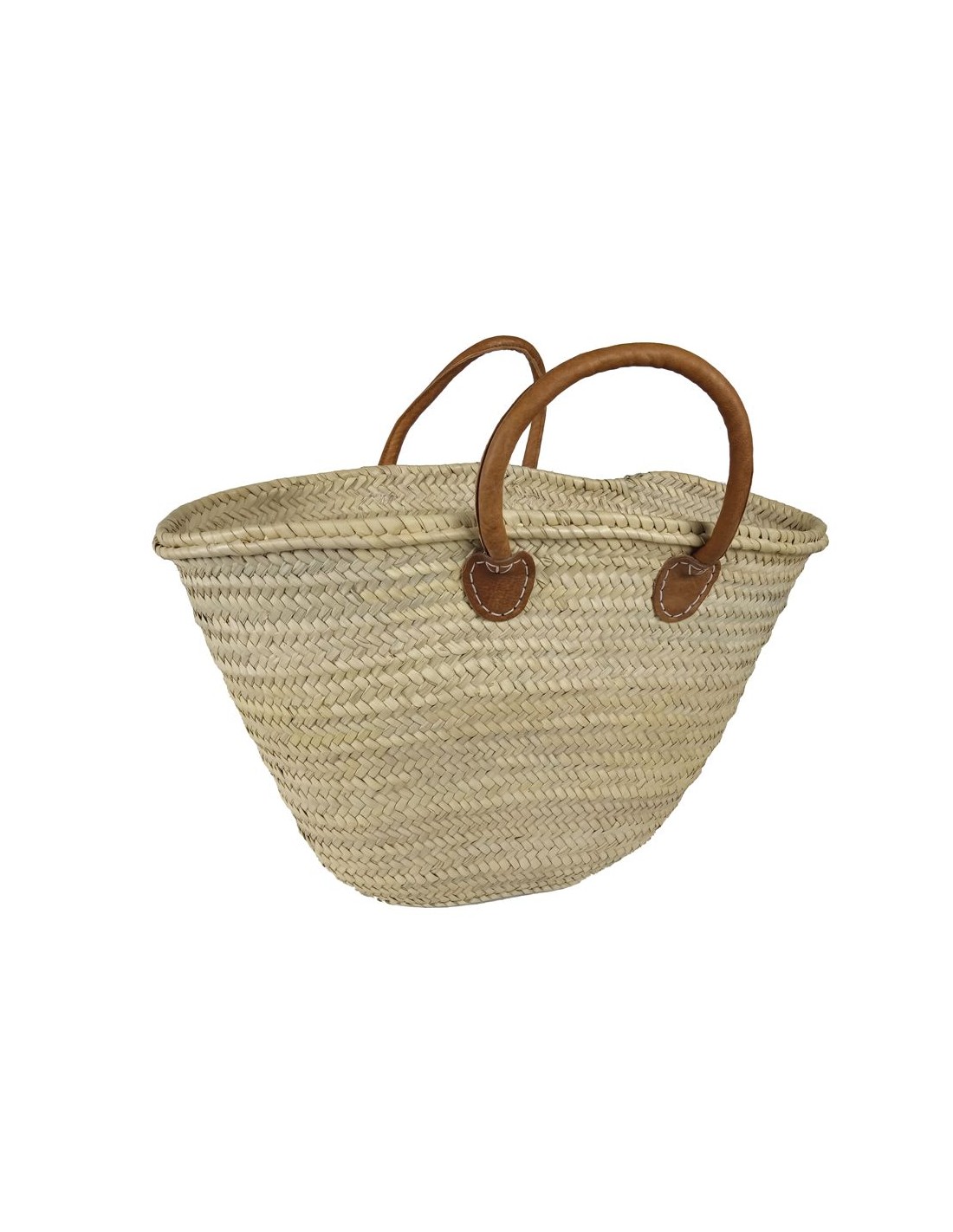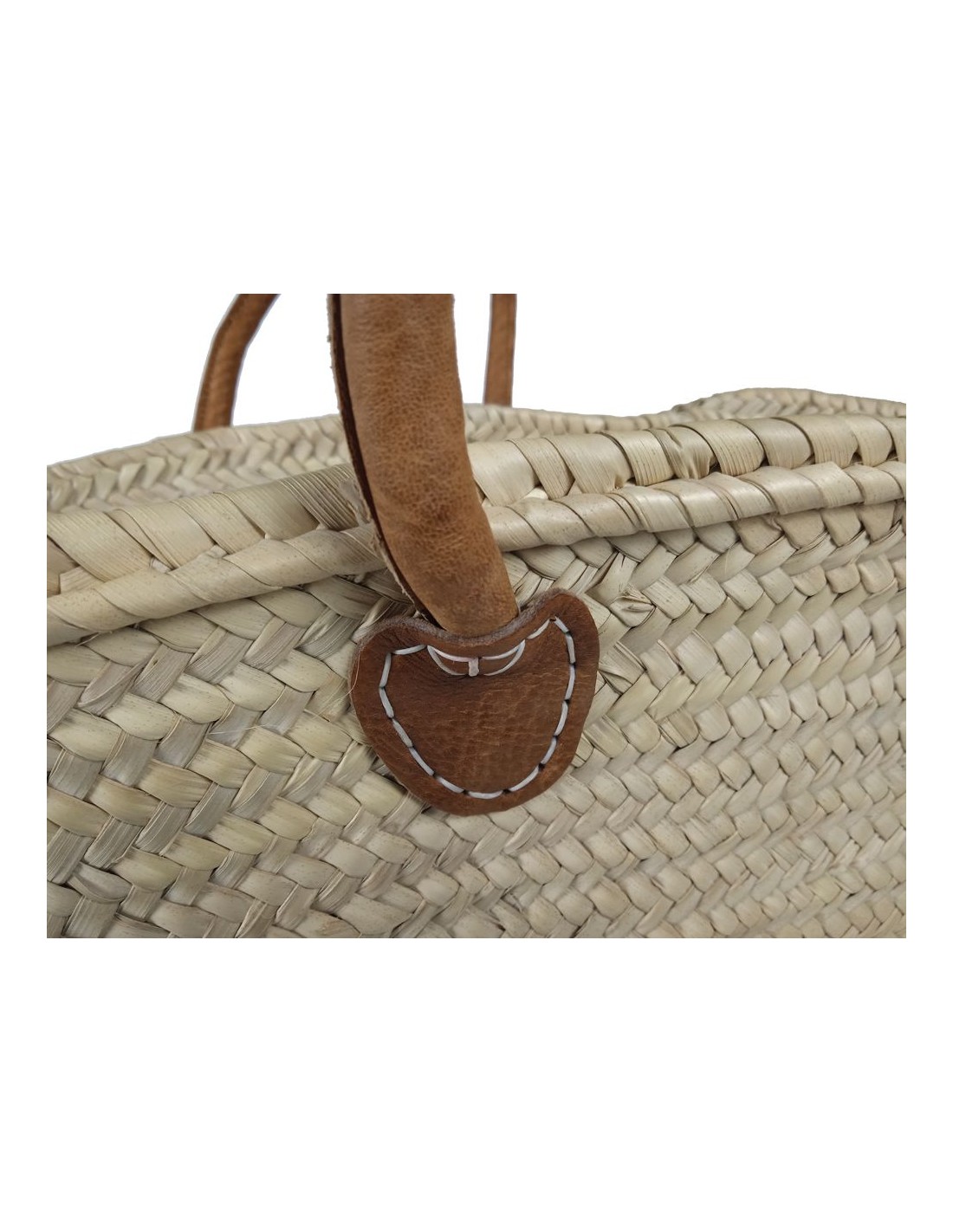 Capazo Mallorquín grande de hoja de palma, cesto de la compra con asa de cuero. Medidas: 36x53x25 cm.