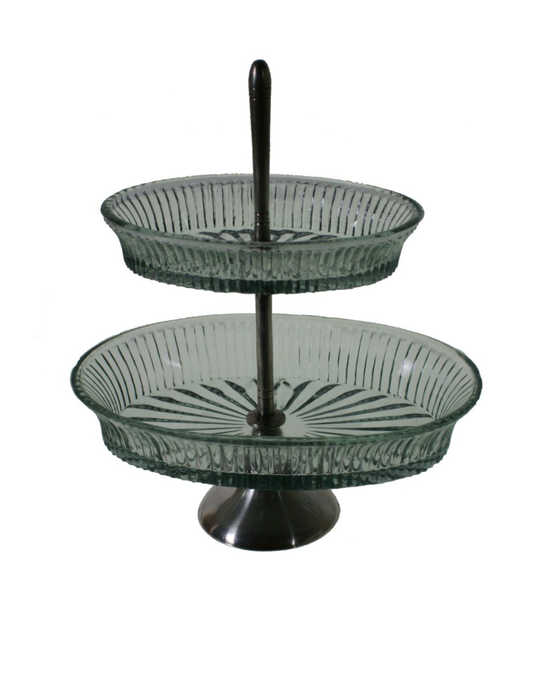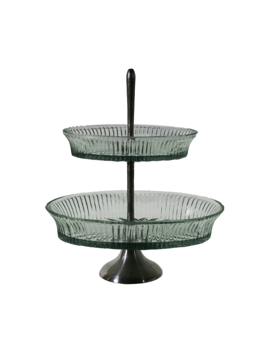 Centro de mesa de dos pisos en vidrio y metal, diseñado con óptica antigua y construcción tradicional. Aporta un toque nostálgico a tu mesa o vitrina, ideal para presentar bombones o dulces pequeños. Perfecto como regalo.