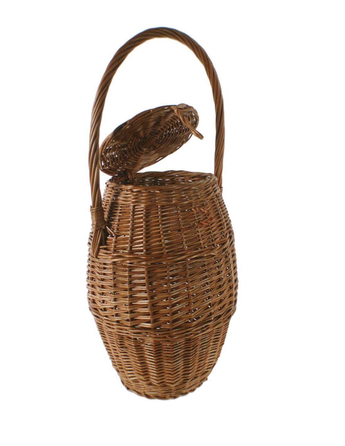 Caracolera artesanal grande de mimbre color miel con asa de transporte. Medidas: 67xØ26 cm.