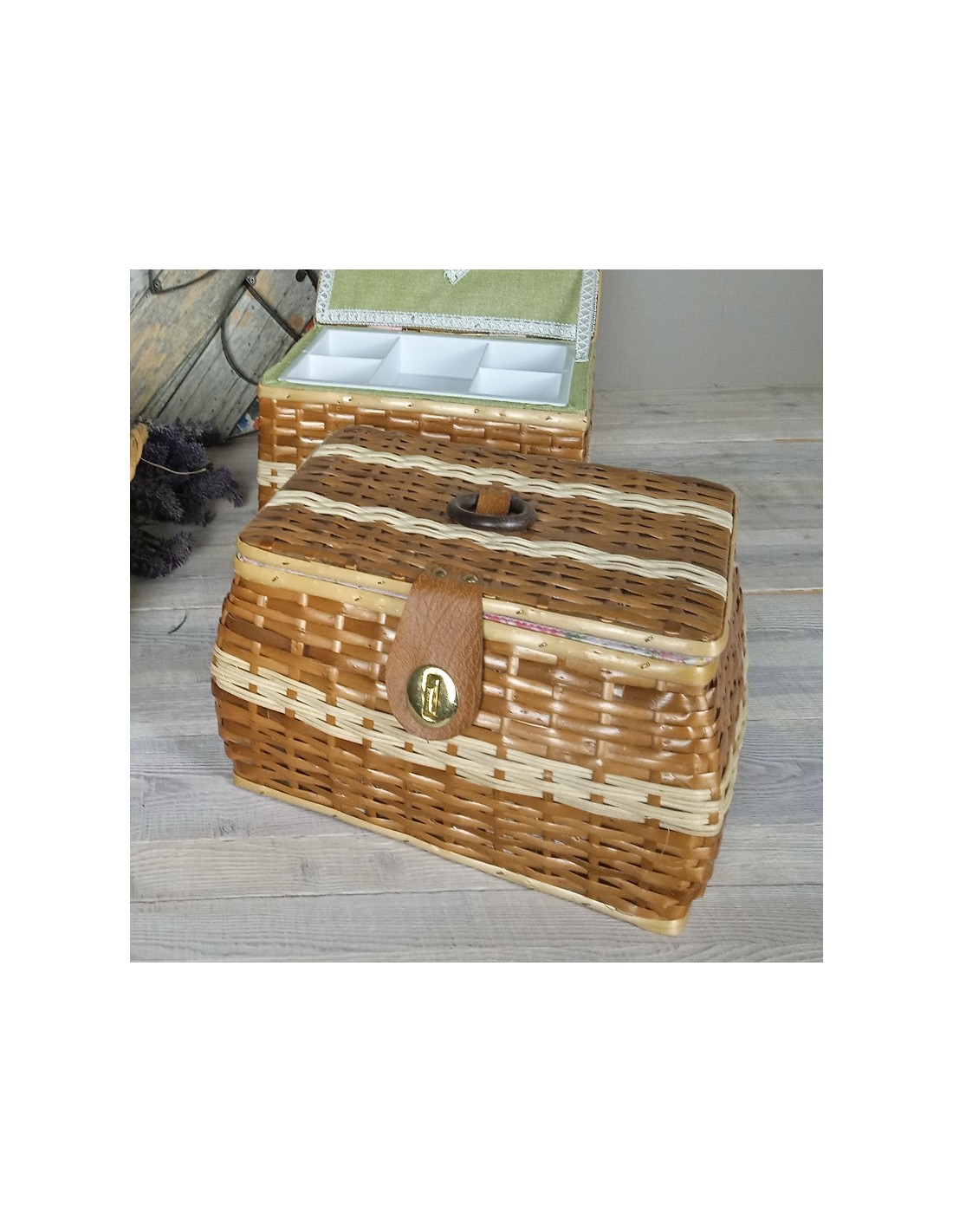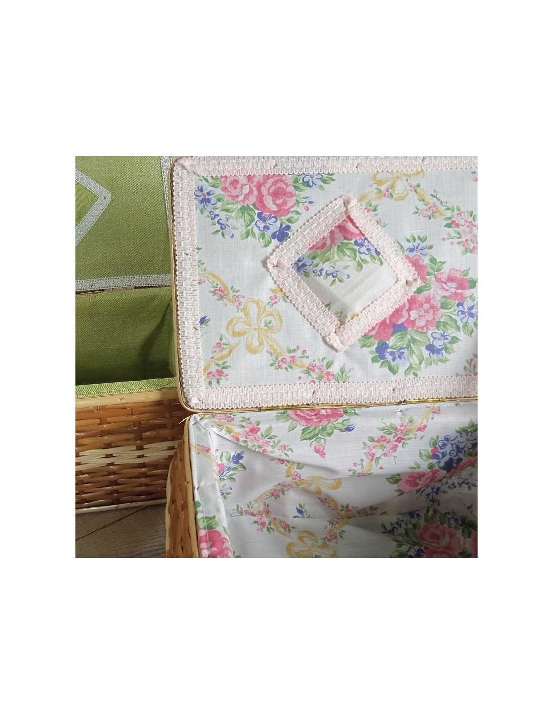 Costurero cesta de mimbre abombado con bandeja interior y forrado en tela vintage para almacenaje de kit de costura, ideal para regalo. Costurero artesanal y producción nacional.
