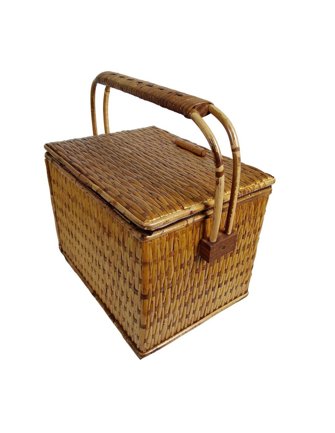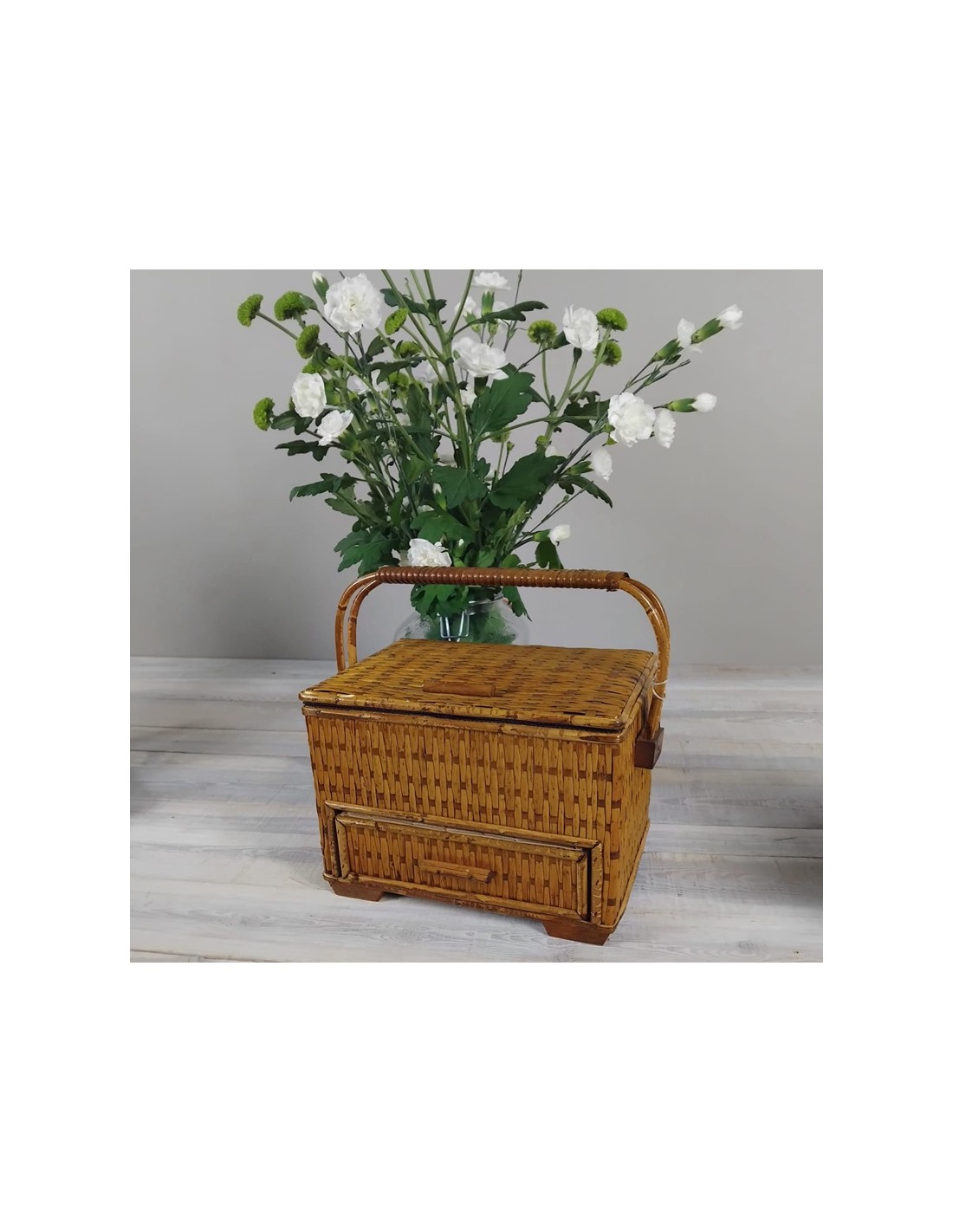 Costurero Grande de Mimbre Natural con Asa y Cajón, Almacenamiento, Labores de Costura. Medidas: 23x30x20 cm.