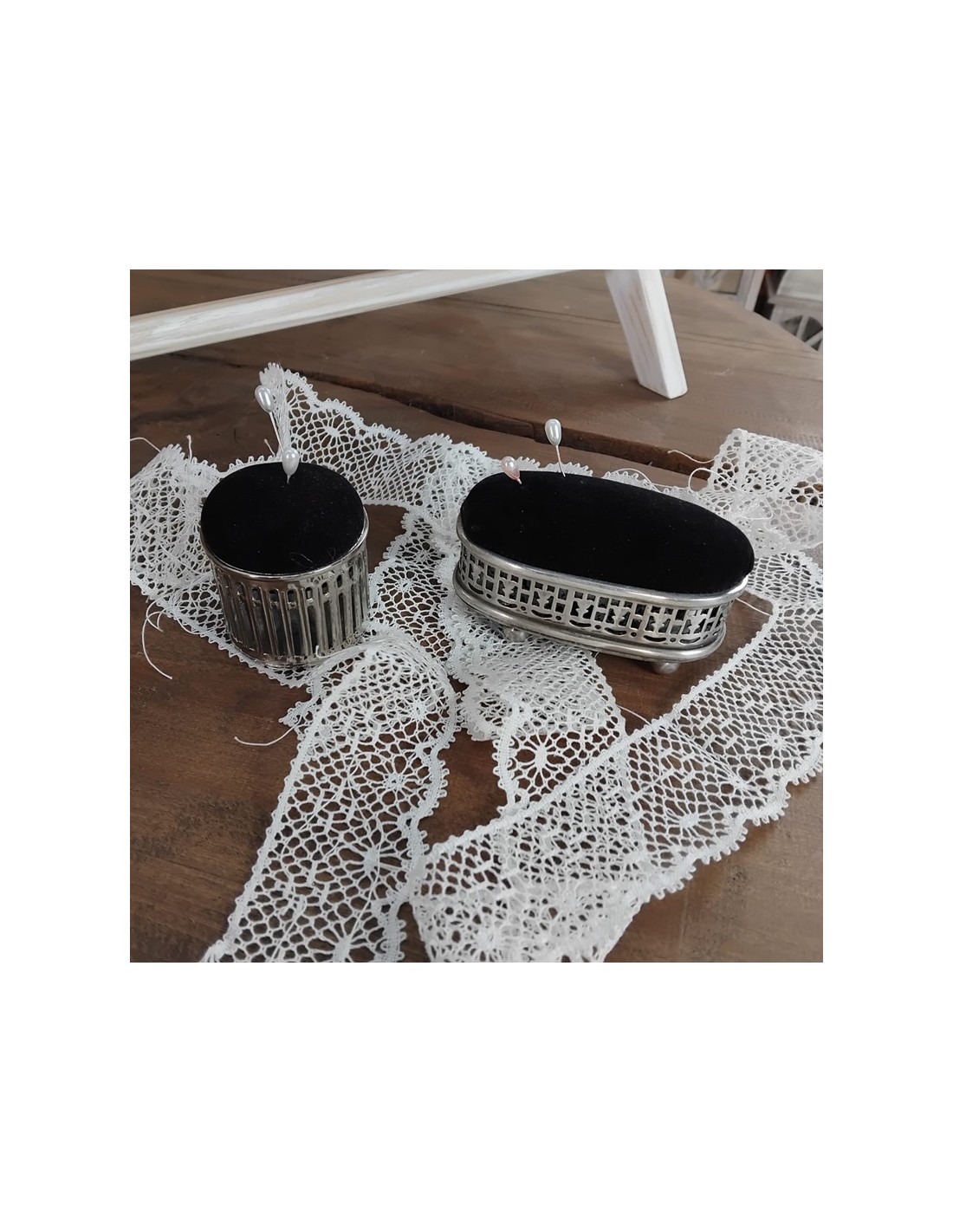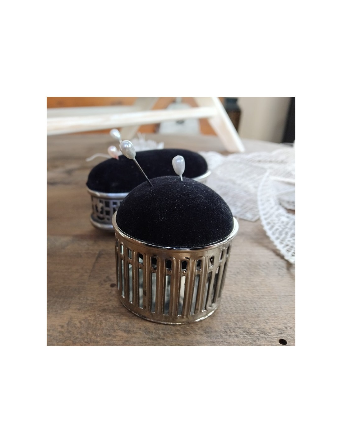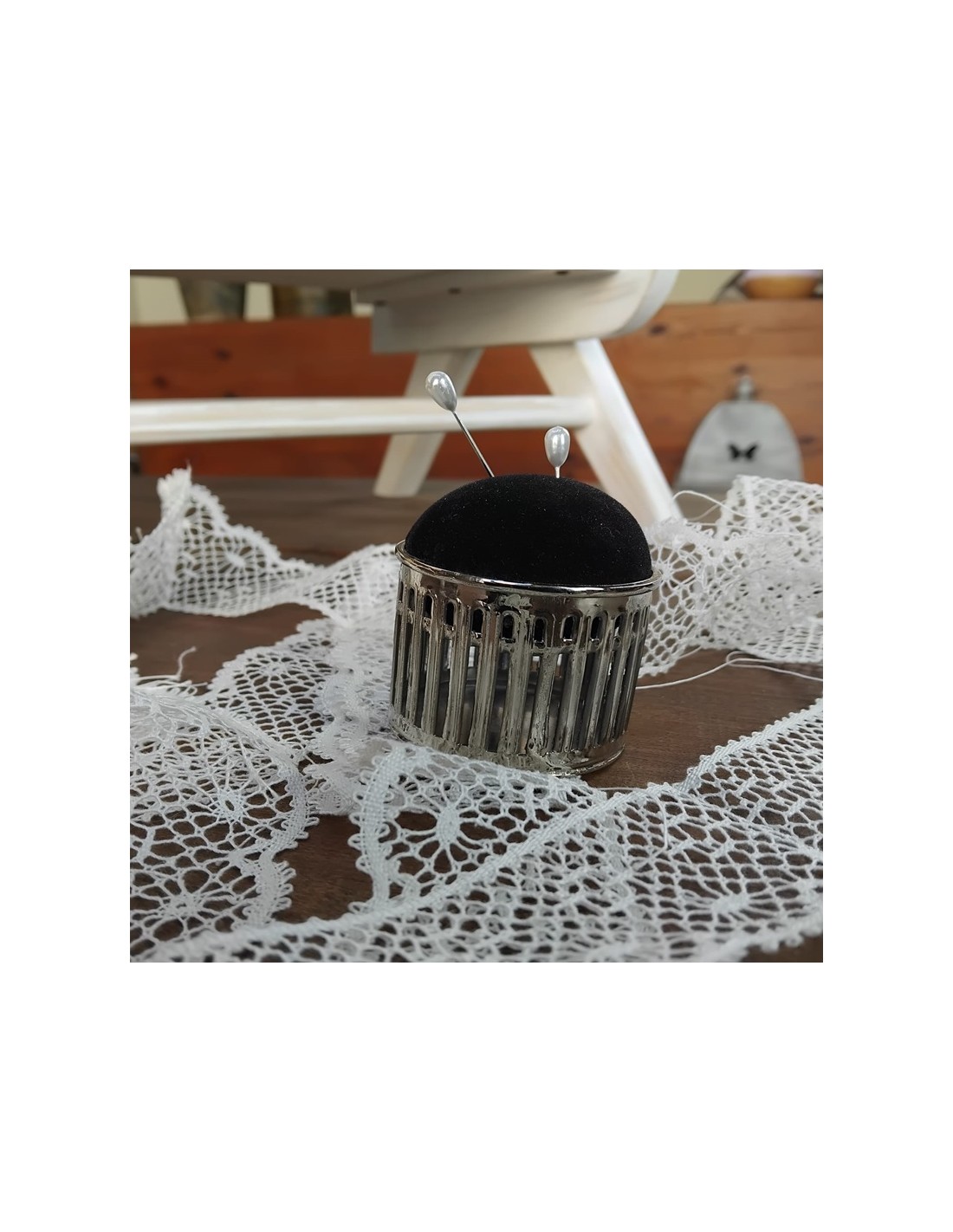 Alfiletero Vintage con Base Metálica – Elegancia y Comodidad para tu Costura