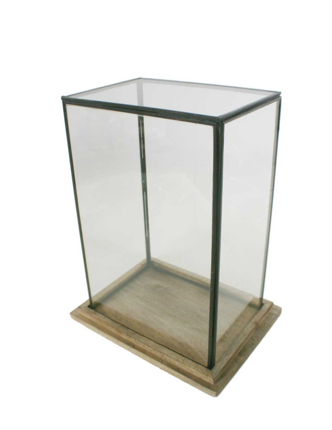 Urna de cristal rectangular con perfil metálico y base de madera natural para exposición decorativa. Medidas: 33x25x18 cm.