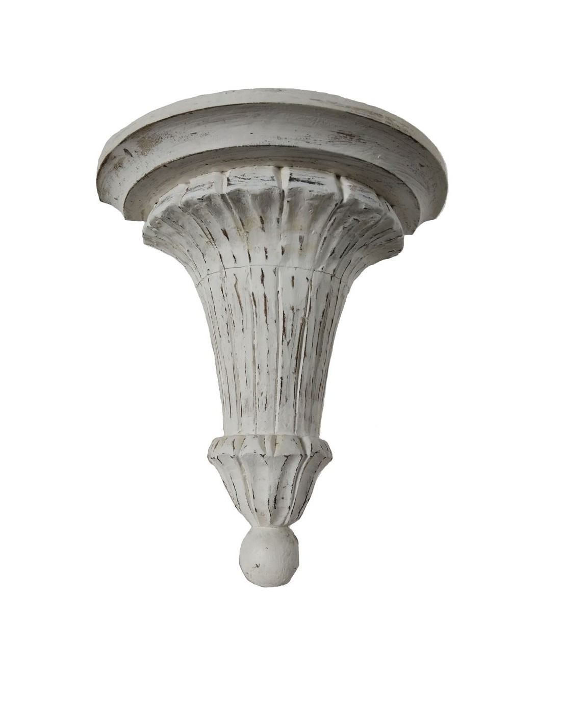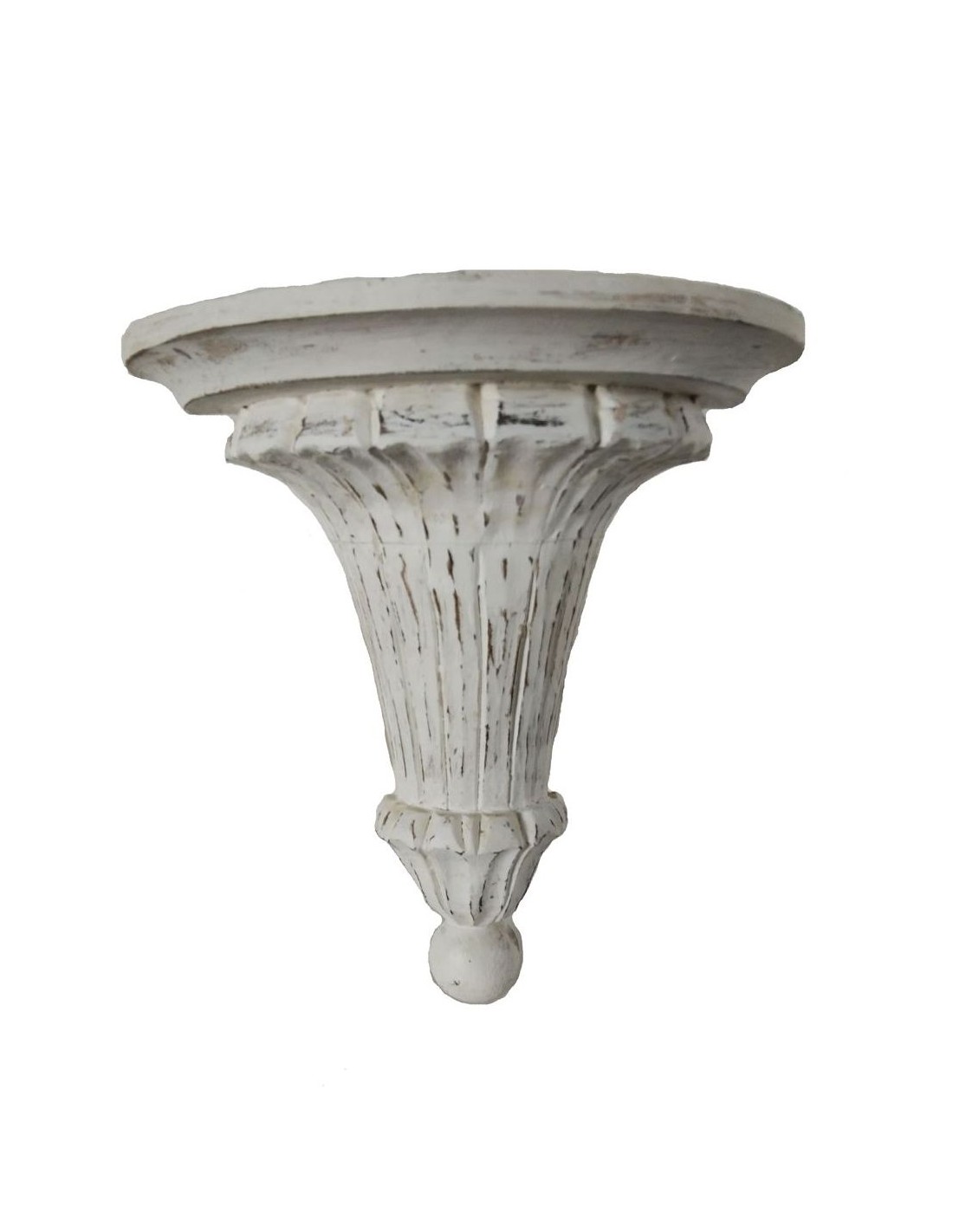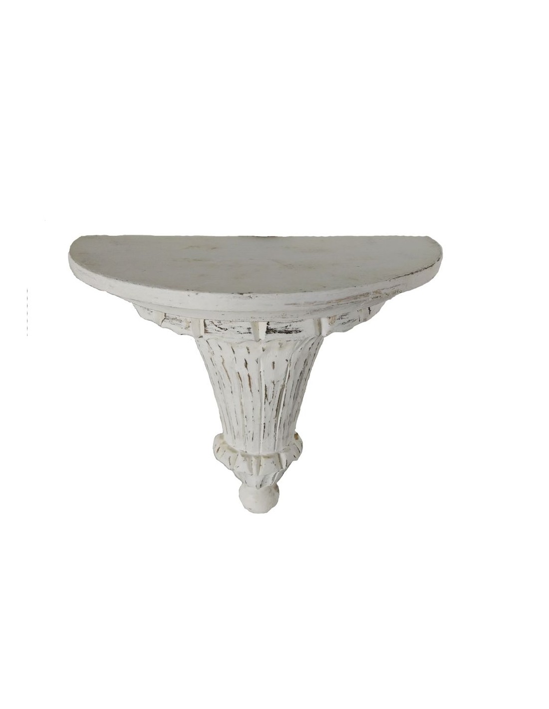 Ménsula Alargada de Pared en Color Blanco Envejecida de Madera Tallada a Mano Exposición y Decoración. Medidas: 29x25x12 cm.