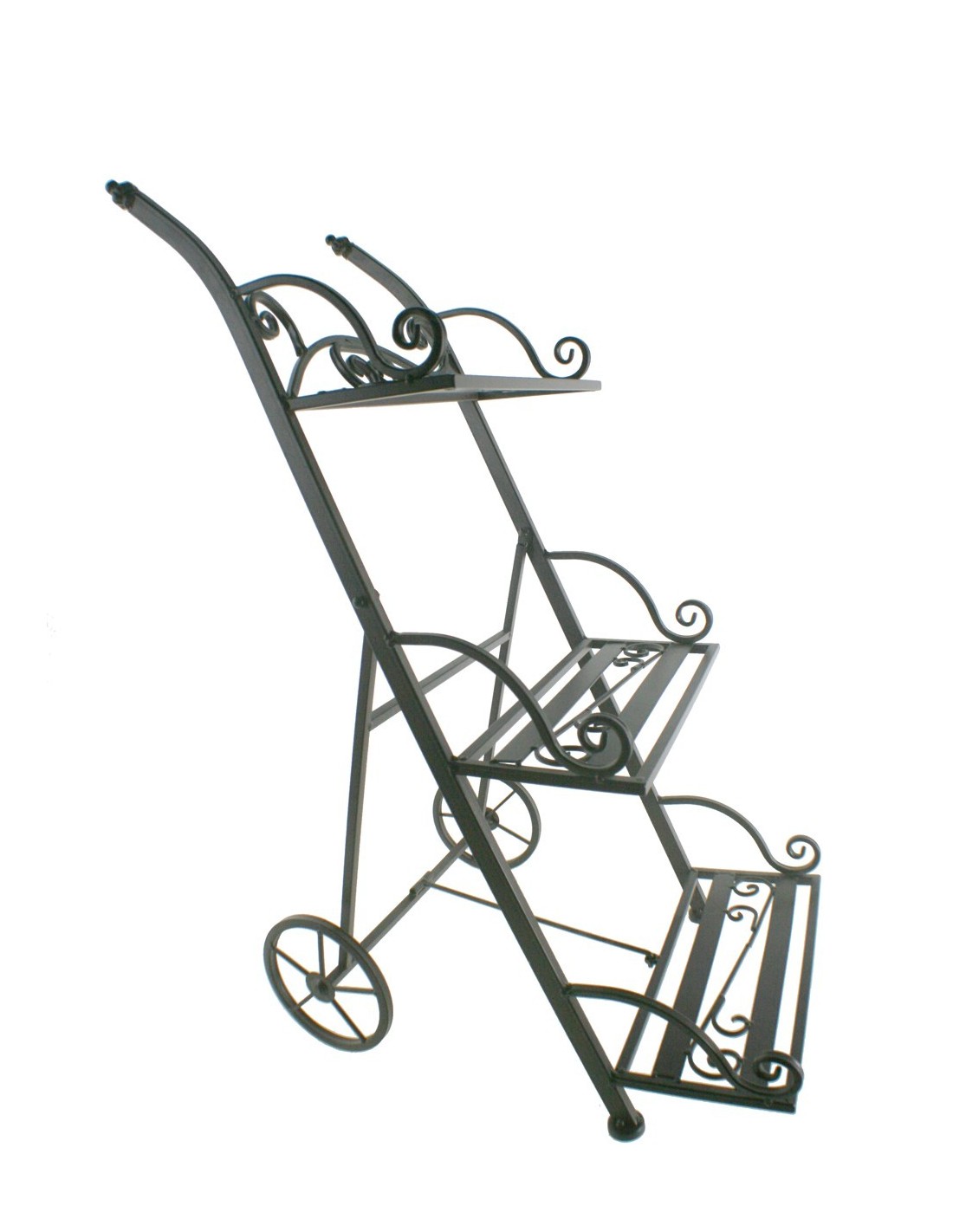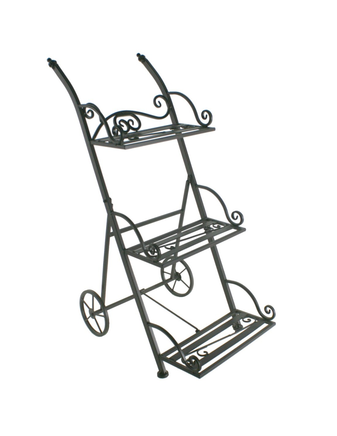 Porta tiestos de metal tipo carrito de tres pisos plegable para plantas, decoración jardín del hogar. Medidas: 82x34x50 cm.