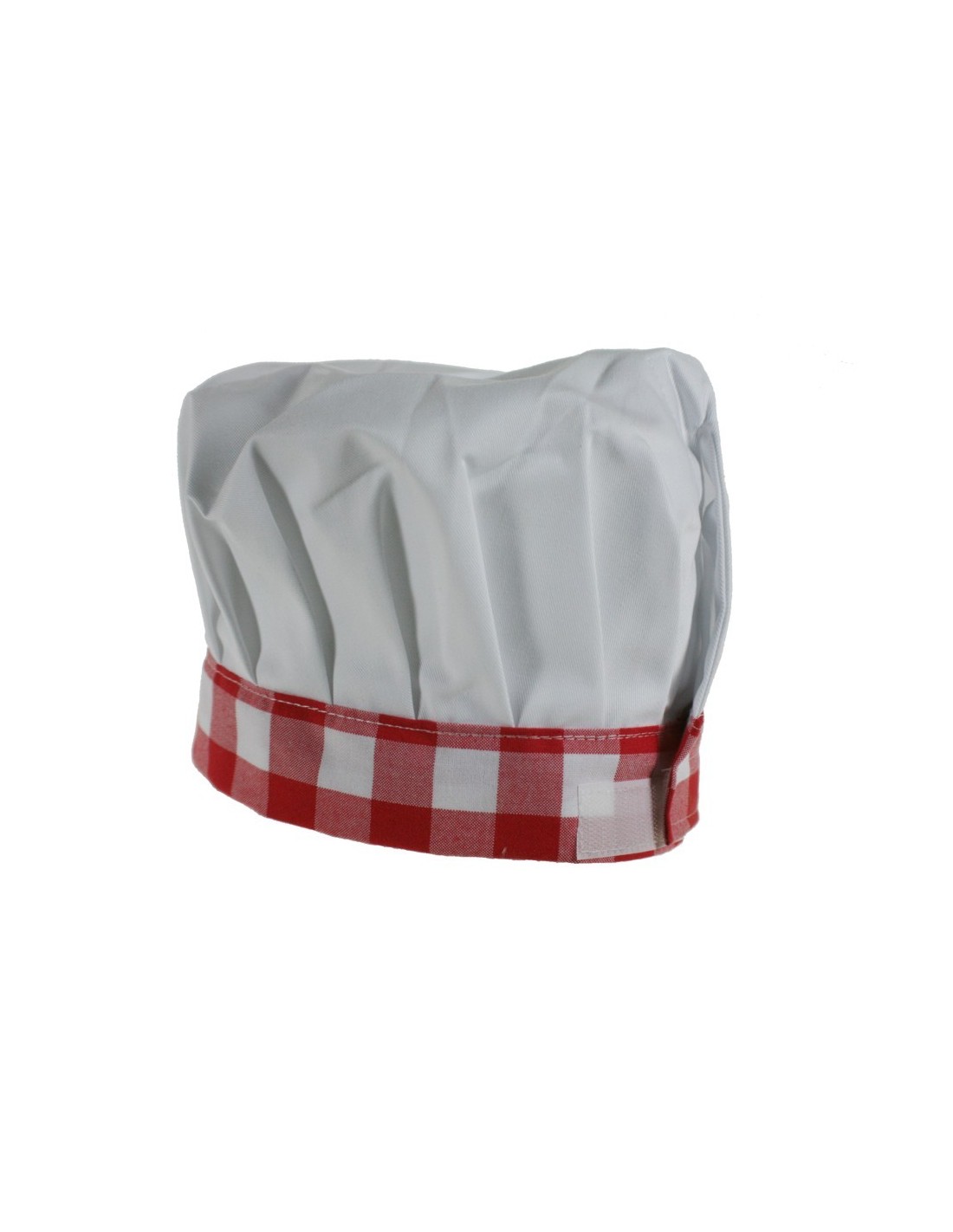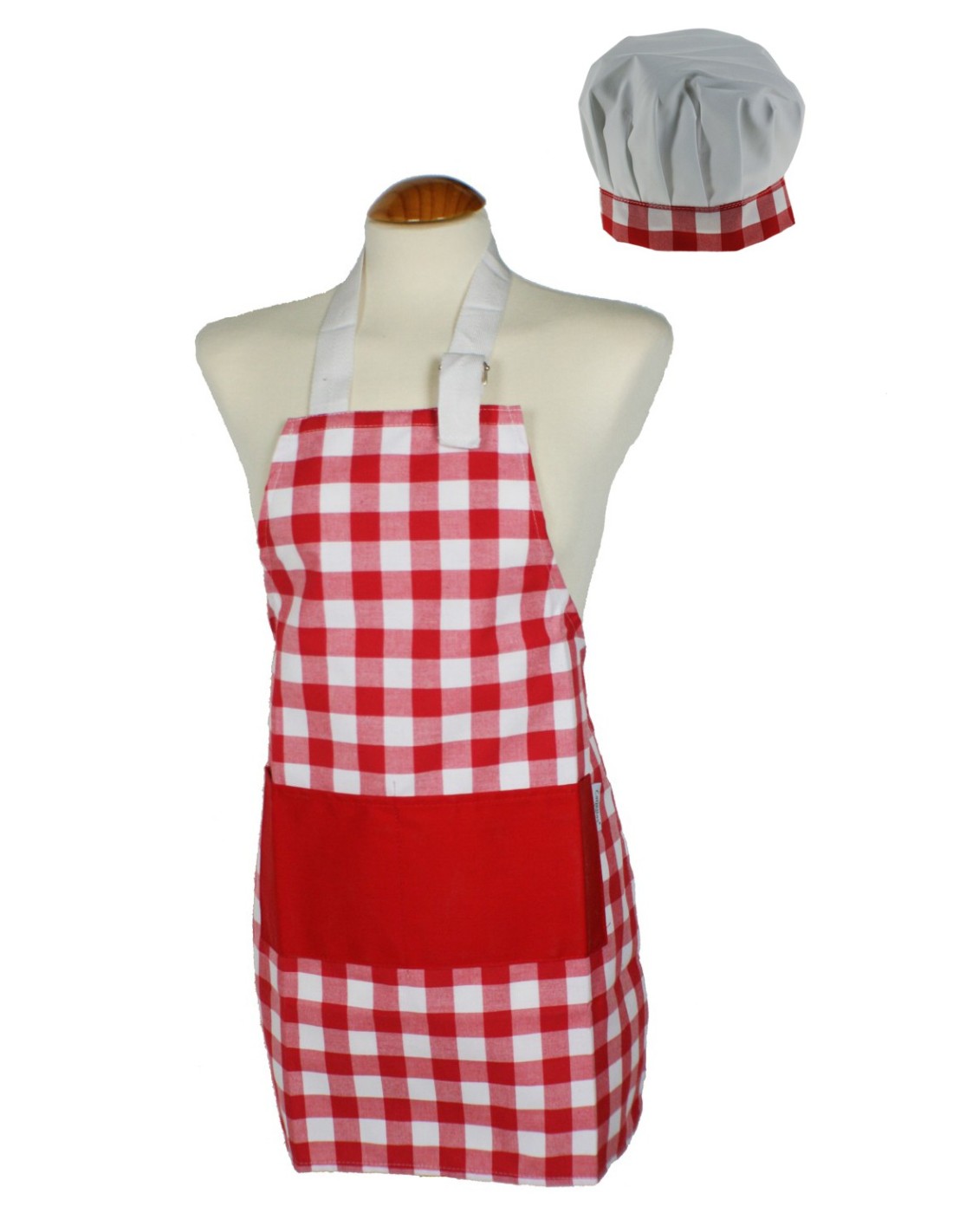 Delantal infantil cocina con gorro y peto ajustable de color rojo a cuadros. Medidas: 65x50 cm.