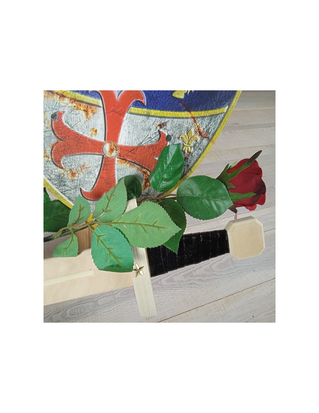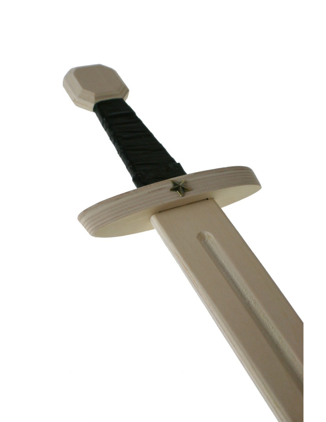 Fabricada en madera laminada resistente, cuenta con una empuñadura forrada para un agarre cómodo y está decorada con un signo de estrella, símbolo de nobleza y valor. Perfecta para combinar con un escudo de caballero y completar así la armadura del pequeño héroe.