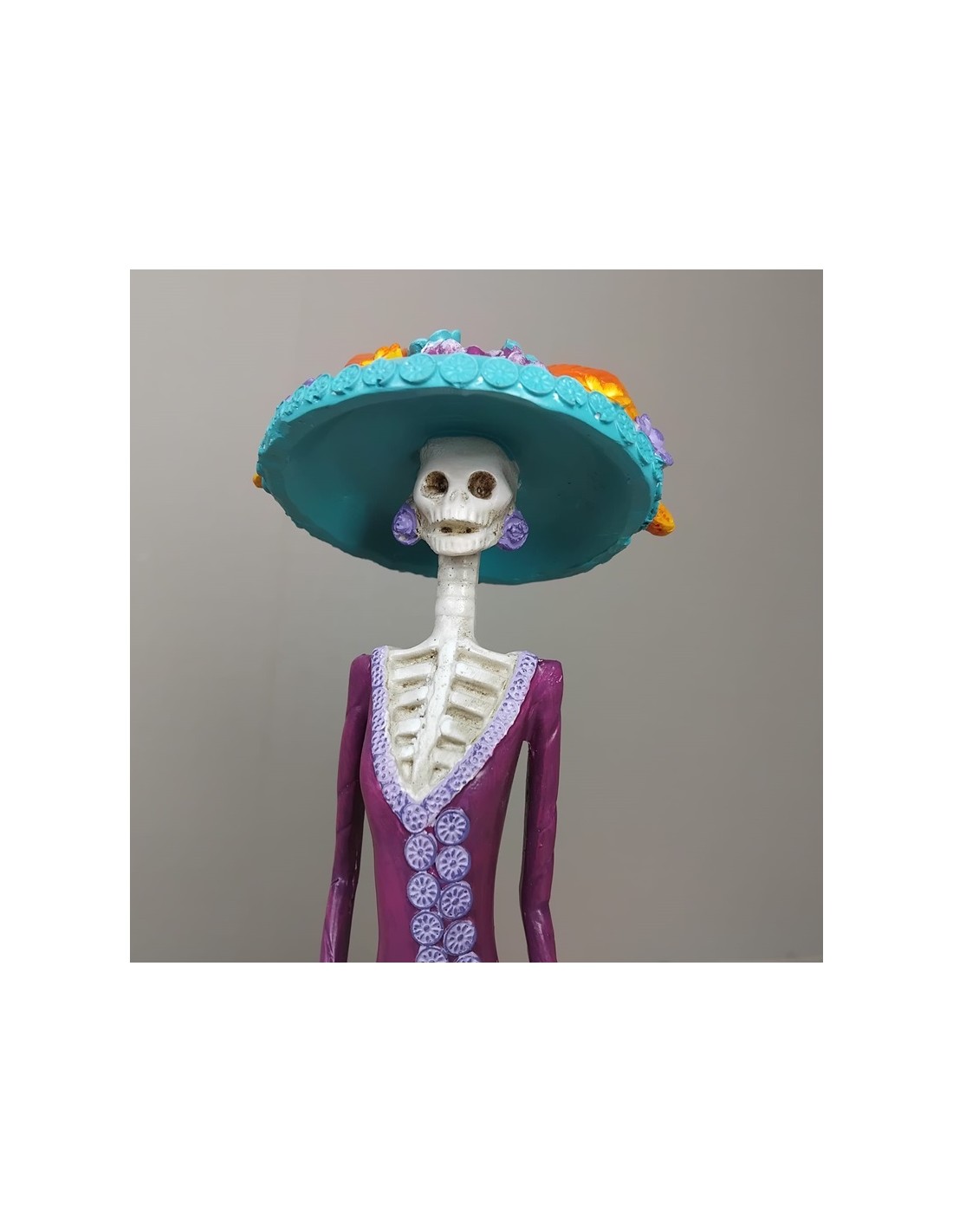 Esta figura de la Catrina destaca por sus finos detalles y su vestimenta en tonos llamativos, realzando su esencia festiva. Su vestido decorado y su sombrero florido la convierten en una pieza única, perfecta para quienes aman la cultura mexicana y sus tradiciones.