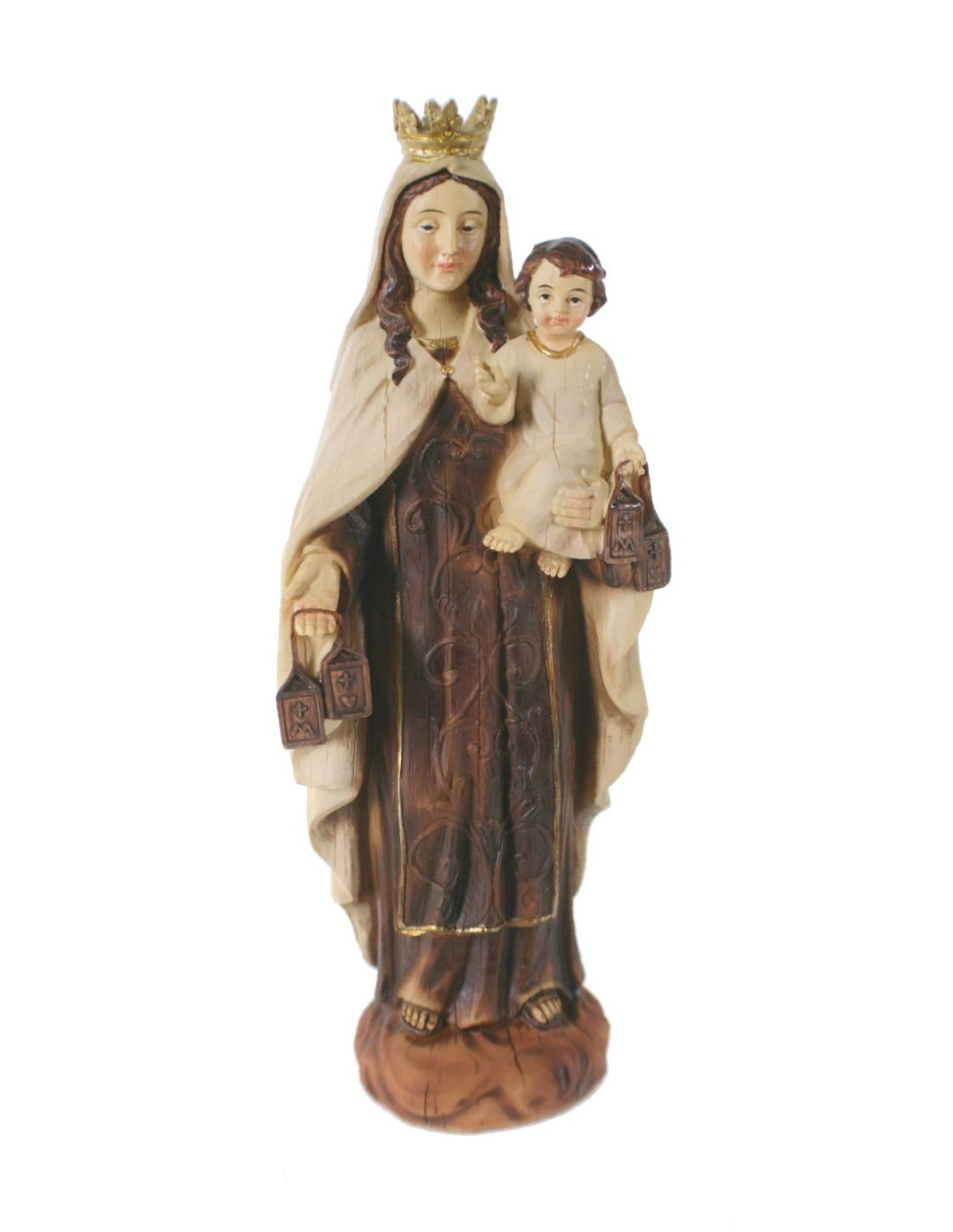 Esta detallada estatua de Nuestra Señora del Carmen representa a la Virgen María bajo la advocación de la patrona de los marineros. Elaborada en resina con una técnica que imita la madera tallada y pintada a mano, es una figura de gran simbolismo y calidad, ideal para espacios de devoción o para regalar.