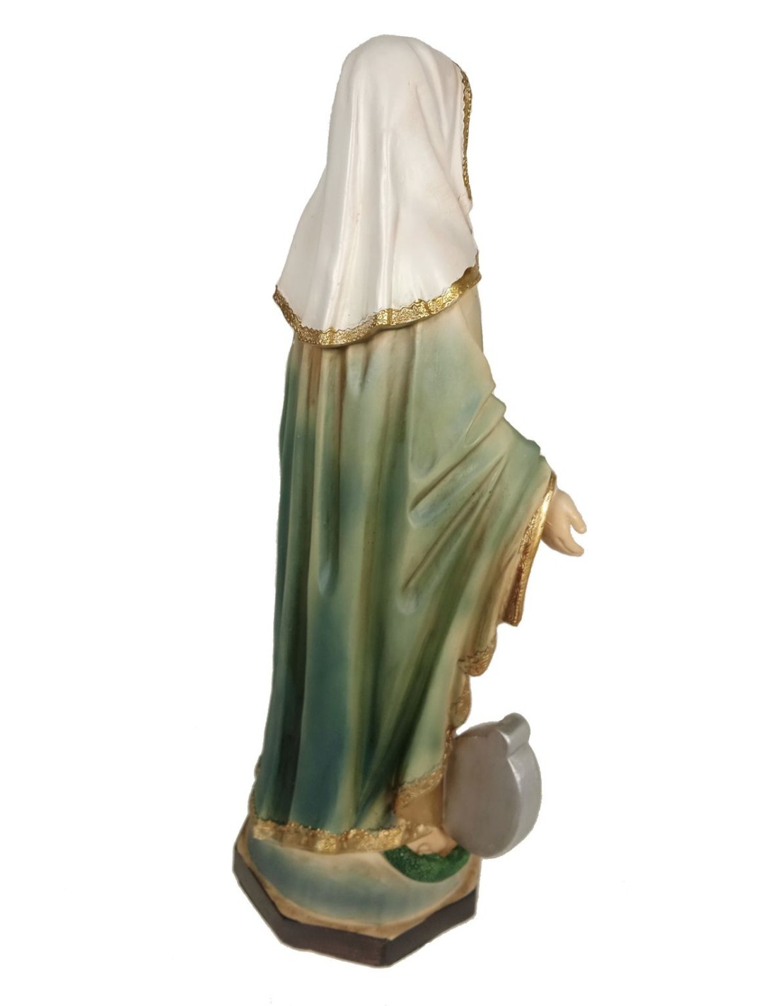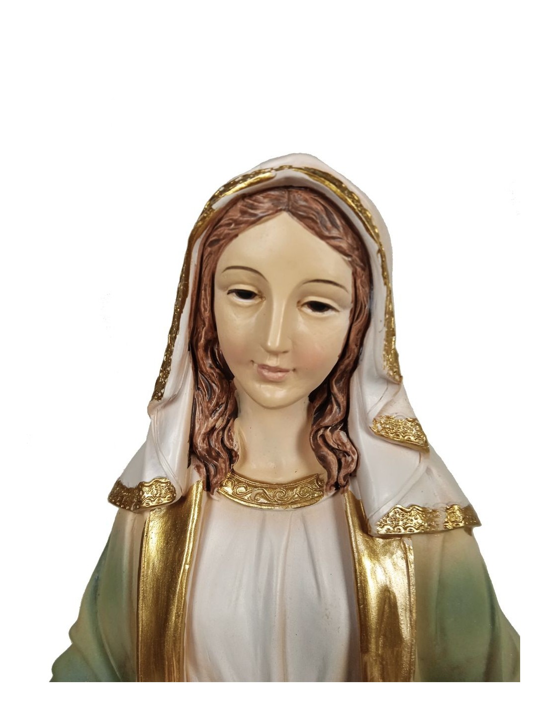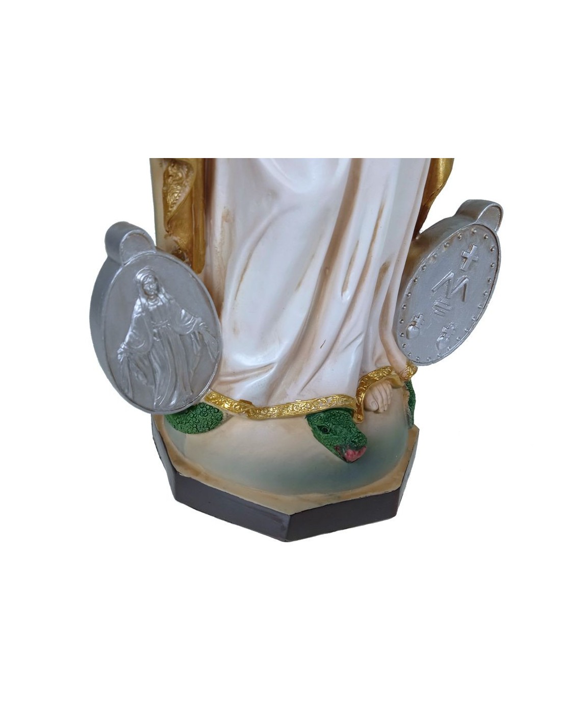 Estatua Figura Virgen Milagrosa con Medallas de Resina y Pintada a Mano Decoración Hogar. Medidas: 31 cm.
