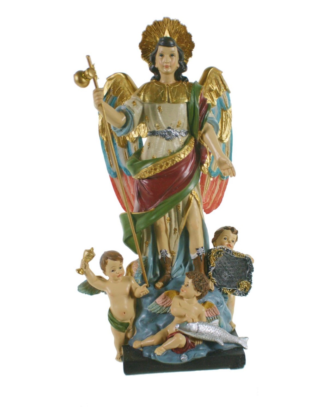 Estatua Figura Religiosa de Culto de San Rafael Arcángel Pintada a Mano Decoración Hogar. Medidas: 26 x9x13 cm.