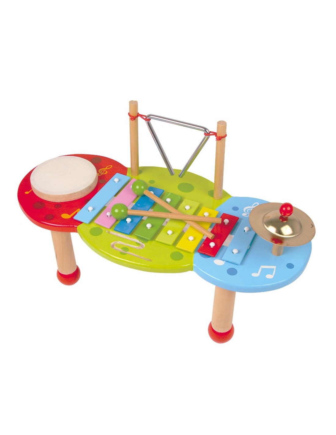 ¡Crea tu propia orquesta con esta Mesa Musical de Madera Multicolor con Xilófono! Este emocionante juego incluye un xilófono de 8 tonos, un triángulo, una campanilla y un tambor, todo en una mesa barnizada. Monta rápidamente tu orquesta y escucha obras maestras con este divertido set musical diseñado especialmente para pequeños amantes.