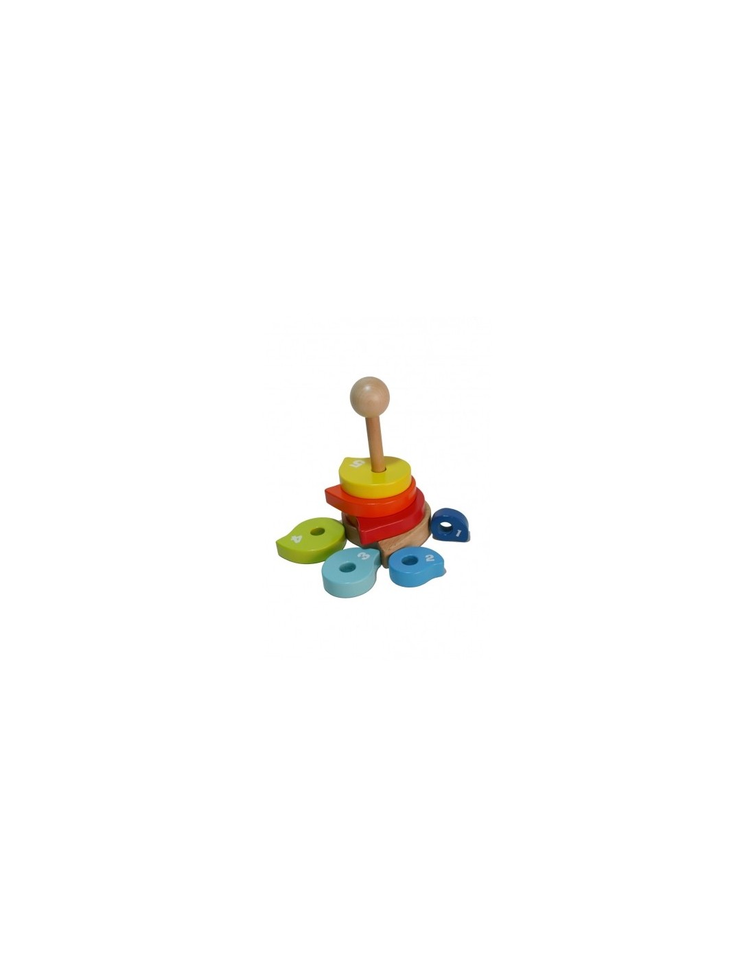 Puzle ecológico de madera maciza con 8 piezas en forma de gota. Ideal para apilar, encajar y ensartar, estimulando destreza, coordinación y aprendizaje de tamaños y colores.