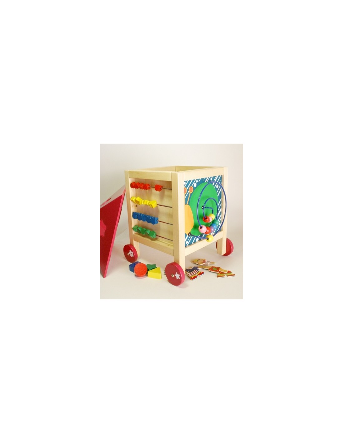 Con su techo extraíble y ruedecitas, se convierte en un baúl rodante fácil de transportar. Los niños disfrutarán de diferentes circuitos de motricidad y rompecabezas, todo en un solo juego.