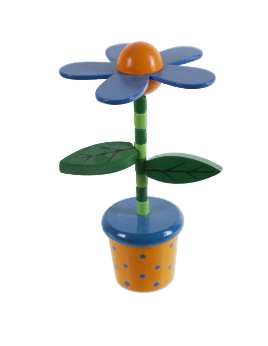 La flor azul de madera articulada es un juguete sencillo, colorido y lleno de encanto. Con solo presionar el resorte situado en la base, la flor cobra vida realizando movimientos divertidos que despiertan la curiosidad de los pequeños.